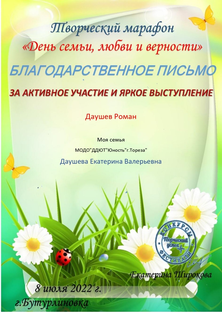 Даушев Роман, обучающийся народного художественного коллектива «Живопись и графика» (педагог Даушева Е.В.), и Тимченко Маргарита, обучающаяся образцового художественного коллектива "Школа красоты" (педагог Москалева Е.В.) награждены благодарственными письмами за активное участие в Международном творческом марафоне «День семьи, любви и верности».