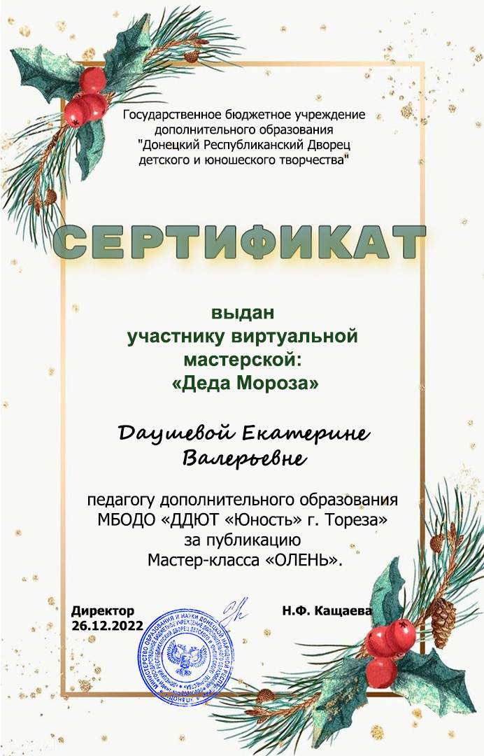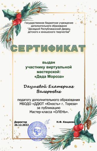 Руководитель народного художественного коллектива «Живопись и графика» Даушева Екатерина Валерьевна награждена сертификатом за участие в виртуальной мастерской Деда Мороза за публикацию мастер-класса «Олень».