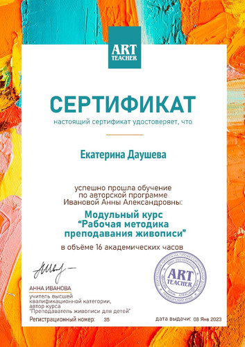 Руководитель народного художественного коллектива «Живопись и графика» Даушева Е.В. награждена сертификатом за обучение по авторской программе Ивановой А.А. «Модульный курс «Рабочая методика преподавания живописи»» (Приморский край).