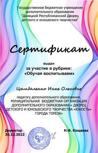 Цымбаленко Инна Олеговна, заведующий организационно-массовым отделом, награждена сертификатом за участие в рубрике «Обучая воспитываем» от ГБУДО «ДонРДДЮТ».