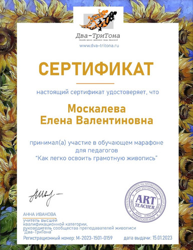 Руководитель образцового художественного коллектива «Школа красоты» Москалева Елена Валентиновна приняла участие в обучающем марафоне «Как легко освоить грамотную живопись» от онлайн-школы живописи Анны Ивановой «Два-ТриТона».