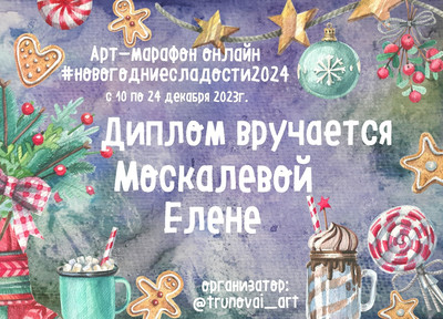 С 10 по 24 декабря педагог МБОДО «ДДЮТ «Юность» Москалева Е.В. приняла участие в арт-марафоне #новогодние сладости2024 и награждена дипломом.