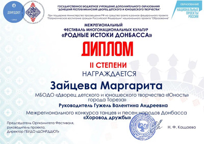 Поздравляем Зайцеву Маргариту, солистку народного ансамбля эстрадной песни «Тоника» (педагог Гужель В.А.), с дипломом Лауреата 2-ой степени за участие в очном этапе Межрегионального фестиваля многонациональных культур «Родные истоки Донбасса» (конкурса танцев и песен народов Донбасса «Хоровод дружбы»).