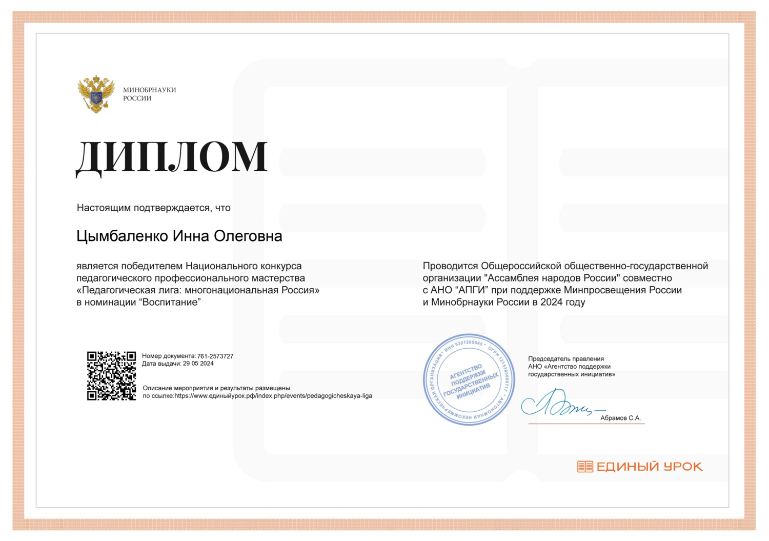Педагог МБОДО «ДДЮТ «Юность» Цымбаленко И.О. стала победителем Национального конкурса профессионального мастерства «Педагогическая лига; многонациональная Россия» в номинации «Воспитание» и «Педагогическая лига: ФГОС и ФООП» в номинации «ФГОС и ФООП дошкольного образования». Конкурс проходил на платформе «Единый урок».
