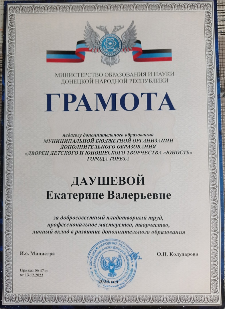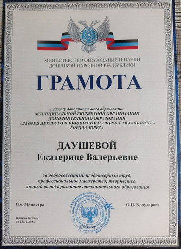 Педагог Дворца творчества Даушева Екатерина Валерьевна награждена грамотой Министерства образования и науки ДНР за добросовестный плодотворный труд, профессиональное мастерство, творчество, личный вклад в развитие дополнительного образования.