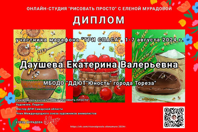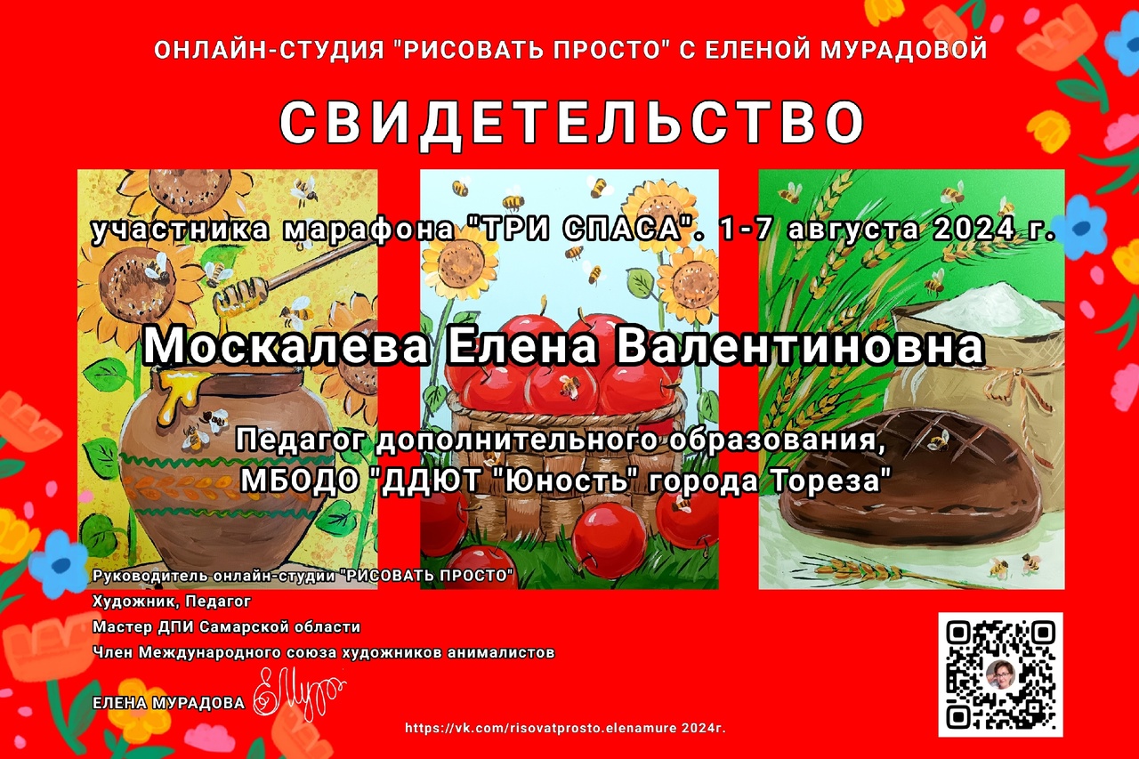 Педагоги Дворца творчества приняли участие в марафоне «Три Спаса» от онлайн-студии «Рисовать просто» с Еленой Мурадовой. Даушева Екатерина Валерьевна получила диплом за участие, а Москалева Елена Валентиновна - свидетельство об обучении.