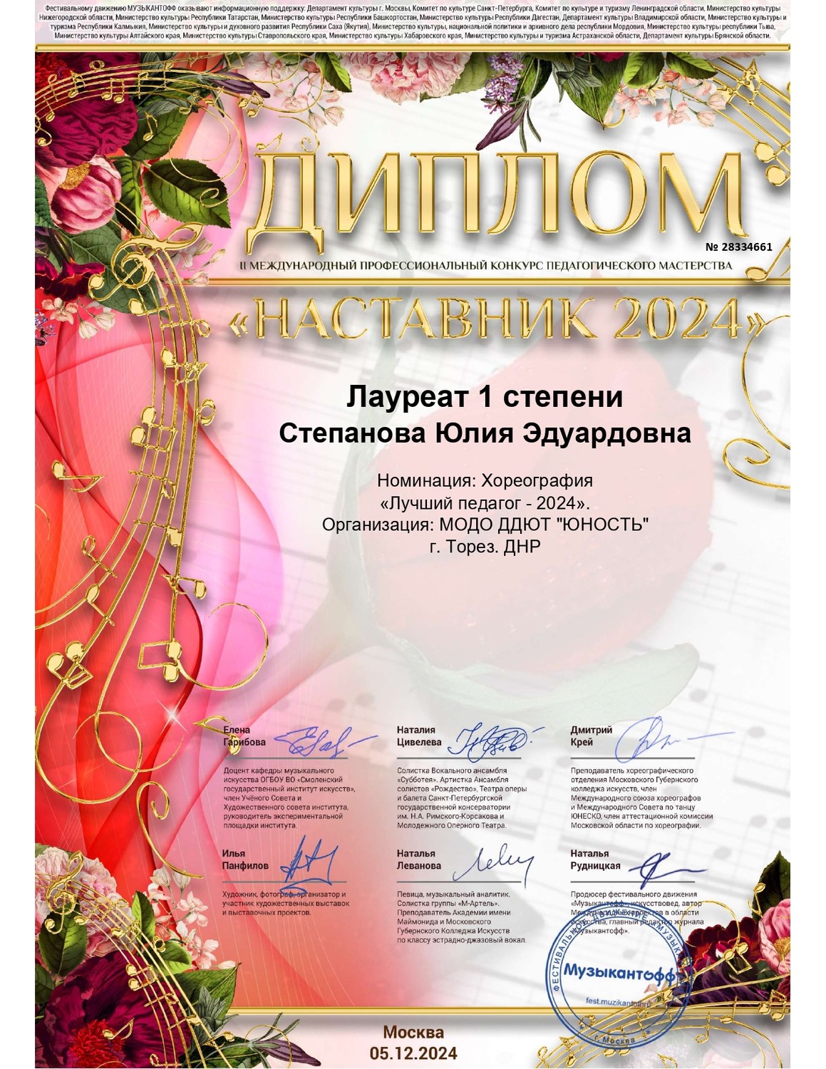 Педагог Дворца творчества Степанова Ю.Э. стала лауреатом 1-ой степени II Международного профессионального конкурса педагогического мастерства «Наставник 2024», г. Москва, номинация «Хореография».
