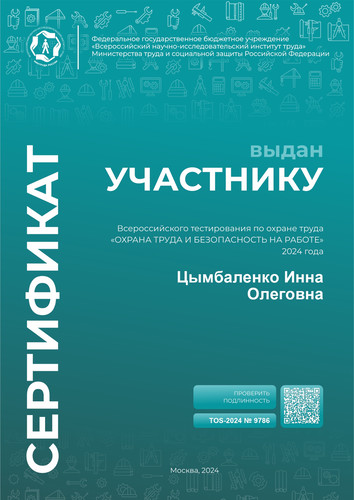 Педагог Дворца творчества Цымбаленко И.О. 5 декабря стала участником Всероссийского тестирования по охране труда «Охрана труда и безопасность на работе», г. Москва.