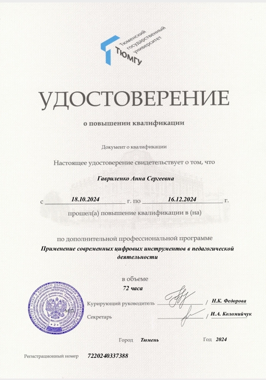 Педагоги Дворца творчества Гавриленко А.С. и Цымбаленко И.О.  с 16.10 по 16.12.2024 прошли курсы повышения квалификации по дополнительной профессиональной программе «Применение современных цифровых инструментов в педагогической деятельности» в Тюменском государственном университете.