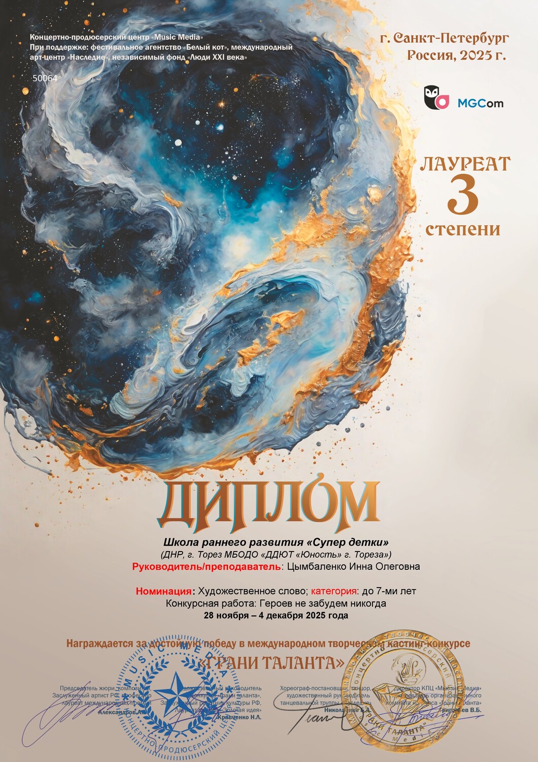 Обучающиеся школы раннего развития «Супер детки» приняли участие в Международном творческом кастинг-конкурсе «Грани таланта» (г. Санкт-Петербург) и стали лауреатами 3-ей степени (номинация «Художественное слово»).