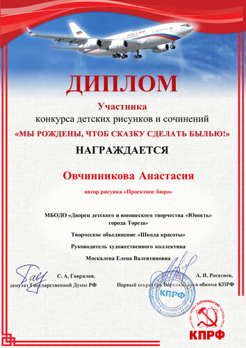 Обучающаяся образцового художественного коллектива «Школа красоты» (педагог Москалева Е.В.) Овчинникова Анастасия получила диплом участника конкурса детских рисунков и сочинений «Мы рождены, чтоб сказку сделать былью».