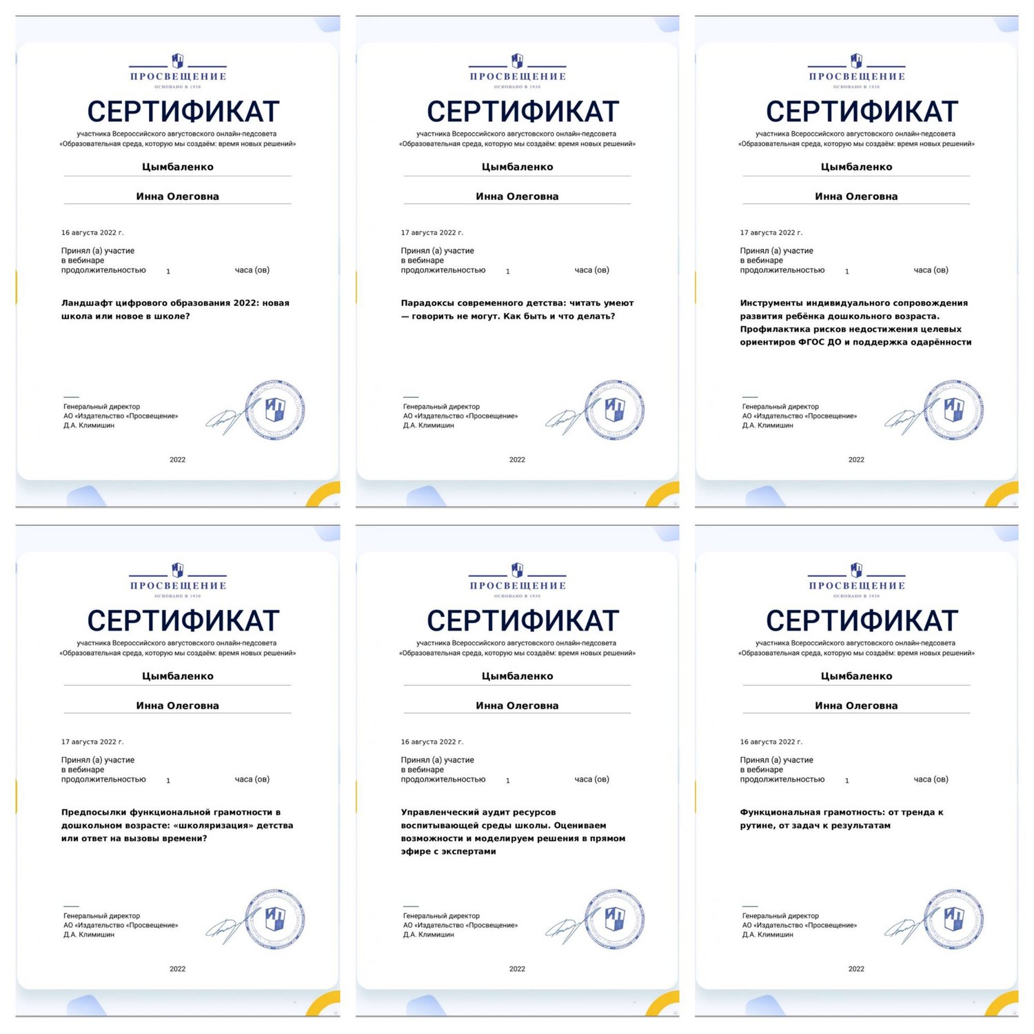 16 и 17 августа на платформе «Просвещение» состоялась онлайн-конференции «Августовское педагогическое совещание работников образования - 2022», в которой приняла участие педагог Цымбаленко И.О., получив сертификаты за прослушанные вебинары. Августовское совещание – традиционное событие для всего педагогического сообщества страны. Подготовка к учебному году, определение актуальных вызовов и решений, которые современная школа готова предложить, – все это будут обсуждать учителя в каждом регионе России. Ключевой темой Всероссийского августовского онлайн-педсовета, организованного Группой компаний «Просвещение», стала переход на обновленные ФГОС. Были рассмотрены вопросы формирования и оценки функциональной грамотности, новые подходы к организации современной воспитывающей среды в детских садах и школах, использование верифицированного цифрового образовательного контента для обучения, взаимодействие с родителями и актуальные навыки педагога. Педагог приняла участие в вебинарах: «Функциональная грамотность: от тренда к рутине, от задач к результатам», «Роль школьного урока в воспитании гражданина: средства, способы, приёмы», «Управленческий аудит ресурсов воспитывающей среды школы. Оцениваем возможности и моделируем решения в прямом эфире с экспертами», «Парадоксы современного детства: читать умеют — говорить не могут. Как быть и что делать?», «Инструменты индивидуального сопровождения развития ребёнка дошкольного возраста. Профилактика рисков недостижения целевых ориентиров ФГОС ДО и поддержка одарённости», «Ландшафт цифрового образования 2022: новая школа или новое в школе?» и «Предпосылки функциональной грамотности в дошкольном возрасте: «школяризация» детства или ответ на вызовы времени?».