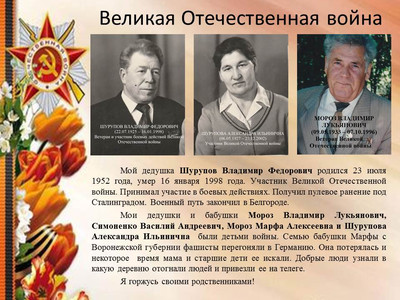 К 77‑летию Великой Победы педагоги Дворца приняли участие в проекте #Бессмертный полкТорез2022#, посвящённый памяти защитников Донбасской земли во время Великой Отечественной войны. Лаврущук Александр Михайлович, 09.12.1912 — 11.08.1988 годы жизни. Зюзин Михаил, начальник санитарного поезда, погиб под Сталинградом. Мишин Павел Афанасьевич был призван в ряды Советской Армии. Воевал в пехоте, дошел до Берлина. Во время боевых действий был тяжело ранен. Вернулся домой на Донбасс в 1946 году.