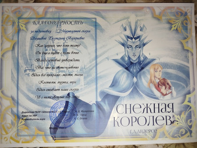 Педагог Дворца творчества Даушева Екатерина Валерьевна награждена благодарностью ГБОУ «Школа № 22» за подготовку музыкальной сказки.