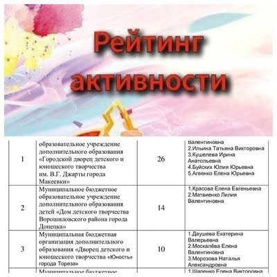Педагоги Дворца творчества Даушева Е.В., Москалева Е.В. и Морозова Н.А. награждены благодарностями за активное участие в создании виртуальной «Энциклопедии педагогического опыта: Современный педагог от теории к практике» от ГБУДО «ДонРДДЮТ» и в рейтинге заняли почётное 3-е место! Поздравляем! | |