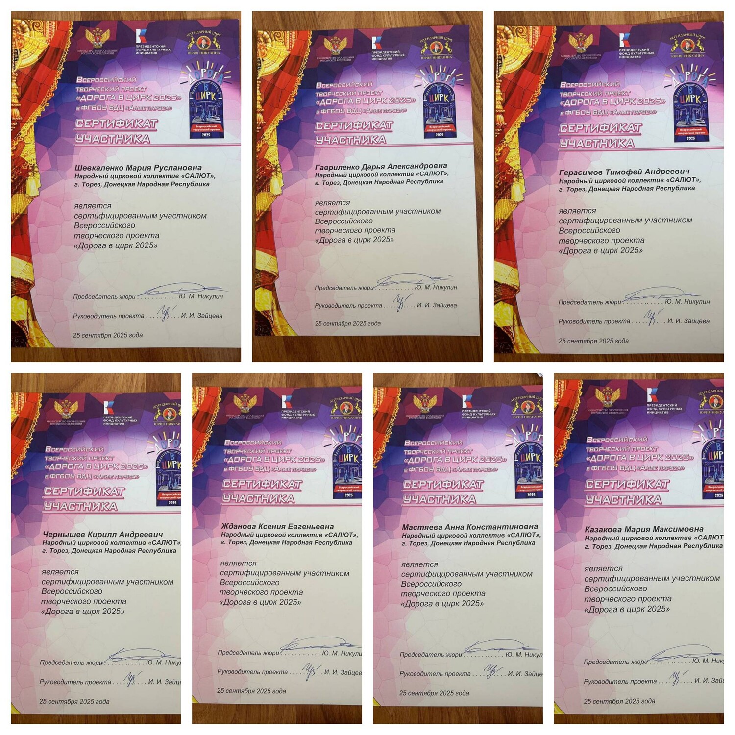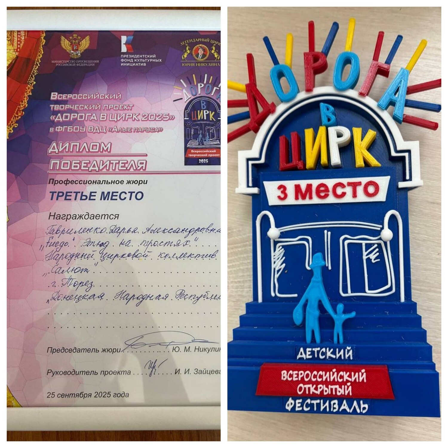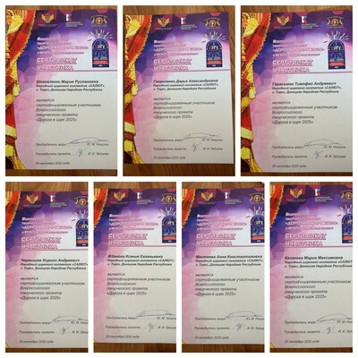 1 октября в Донецкую Народную Республику вернулась делегация воспитанников цирковых коллективов после творческой смены во Всероссийском детском центре «Алые паруса» (г. Евпатория) и Всероссийского фестиваля детского циркового искусства «Дорога в цирк», в составе которой были обучающиеся народного циркового коллектива «Салют» (педагоги Анна и Александр Гавриленко). За 21 день ребята познакомились с профессионалами цирка, прошли мастер-классы, учились и репетировали, обрели новых друзей со всей страны. Главным событием стал фестиваль, где наши артисты завоевали награды. 3 место – Гавриленко Дарья, 7 сертификатов за участие – Чернышев Кирилл, Гавриленко Дарья, Шевкаленко Мария, Казакова Мария, Мастяева Анна, Жданова Ксения, Герасимов Тимофей. Участие коллективов в мероприятиях состоялось благодаря поддержке Министерства культуры ДНР и фонда «ЦИРК И МИЛОСЕРДИЕ». Желаем юным артистам творческих успехов и лёгкой дороги в цирк! | |