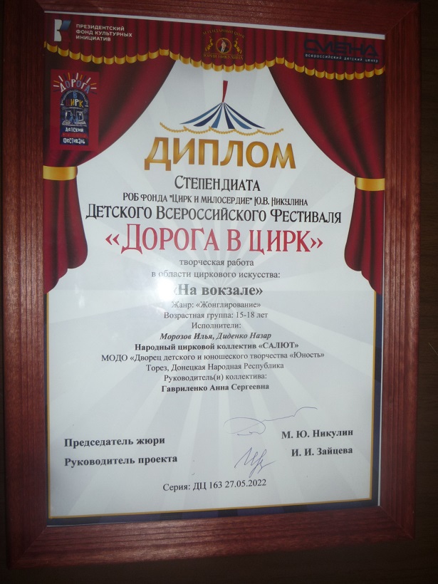 С 25 по 28 мая в г. Анапа Краснодарского края РФ на территории ФГБОУ Всероссийского Детского Центра «Смена» состоялся Детский Всероссийский фестиваль «Дорога в цирк», в котором приняли участие обучающиеся народного циркового коллектива «Салют» (педагоги Анна и Александр Гавриленко) МОДО «ДДЮТ «Юность» Морозов Илья и Диденко Назар. Наши ребята исполнили творческий номер «На вокзале» (жанр «Жонглирование») и получили сертификат участников и специальный приз – Диплом стипендиата! Также им предоставляется возможность отдохнуть до 18 июня во Всероссийском Детском Центре «Смена» по дополнительной общеразвивающей программе. Поздравляем наших юных артистов и руководителей с отличным результатом! Так держать! Первый детский цирковой фестиваль «Дорога в цирк» завершился в Анапе. Его участниками стали 100 воспитанников цирковых школ и училищ в возрасте от 8 до 18 лет из Москвы, Санкт-Петербурга, Ленинградской, Липецкой, Орловской, Ульяновской, Калужской областей, Краснодарского края, Республики Крым и других регионов России, а также из ЛНР и ДНР. Проведение фестиваля стало возможным благодаря гранту Президентского фонда культурных инициатив. 27 мая состоялся гала-концерт, в программу которого вошли лучшие номера конкурсного дня, а также состоялась церемония награждения. Региональный благотворительный фонд «ЦИРК И МИЛОСЕРДИЕ» Ю.В. Никулина премировал стипендиями четырех участников Фестиваля: Народный цирк «Скоморохи» (станица Старощербиновская, Краснодарский край), Образцовая цирковая студия «Созвездие» (г. Выборг), Образцовый детский цирковой коллектив «Кураж» (г. Санкт-Петербург), Народный цирковой коллектив «САЛЮТ» (г. Торез, ДНР). | |