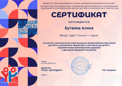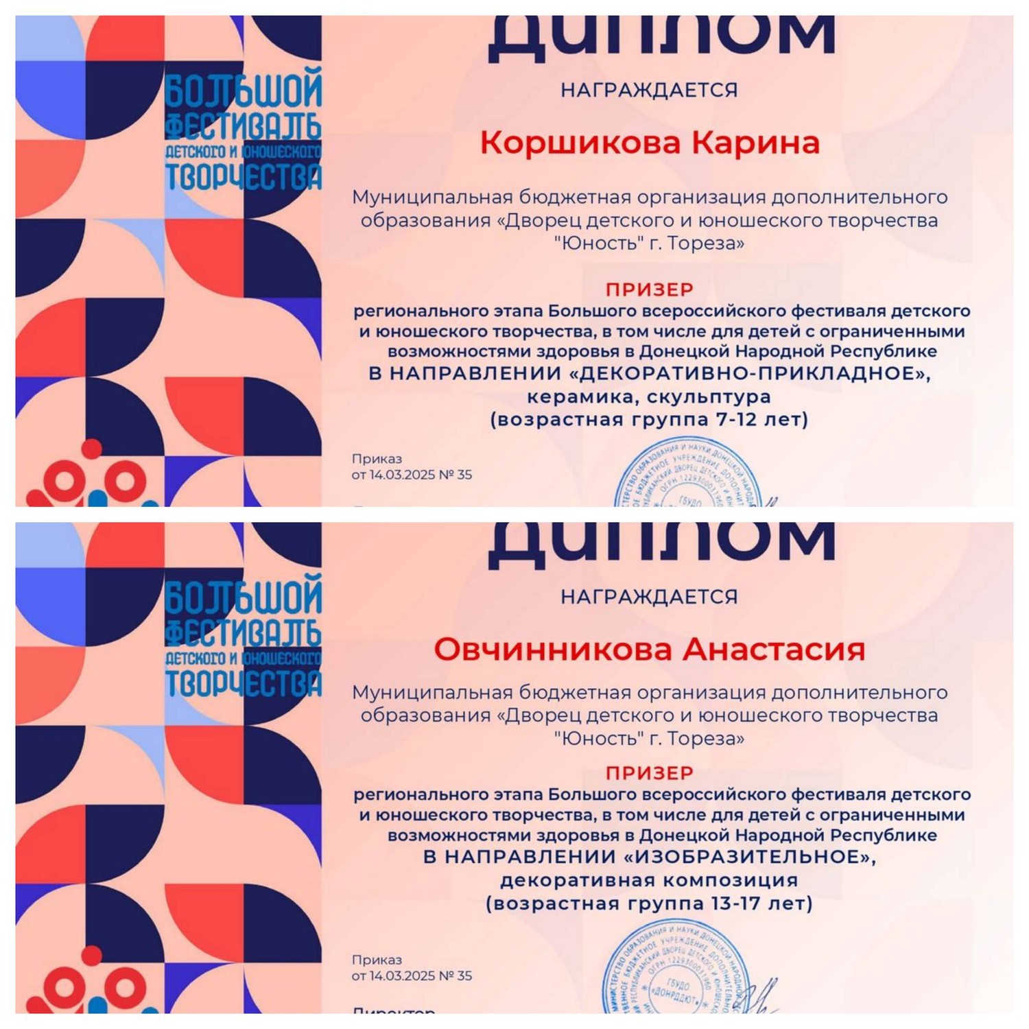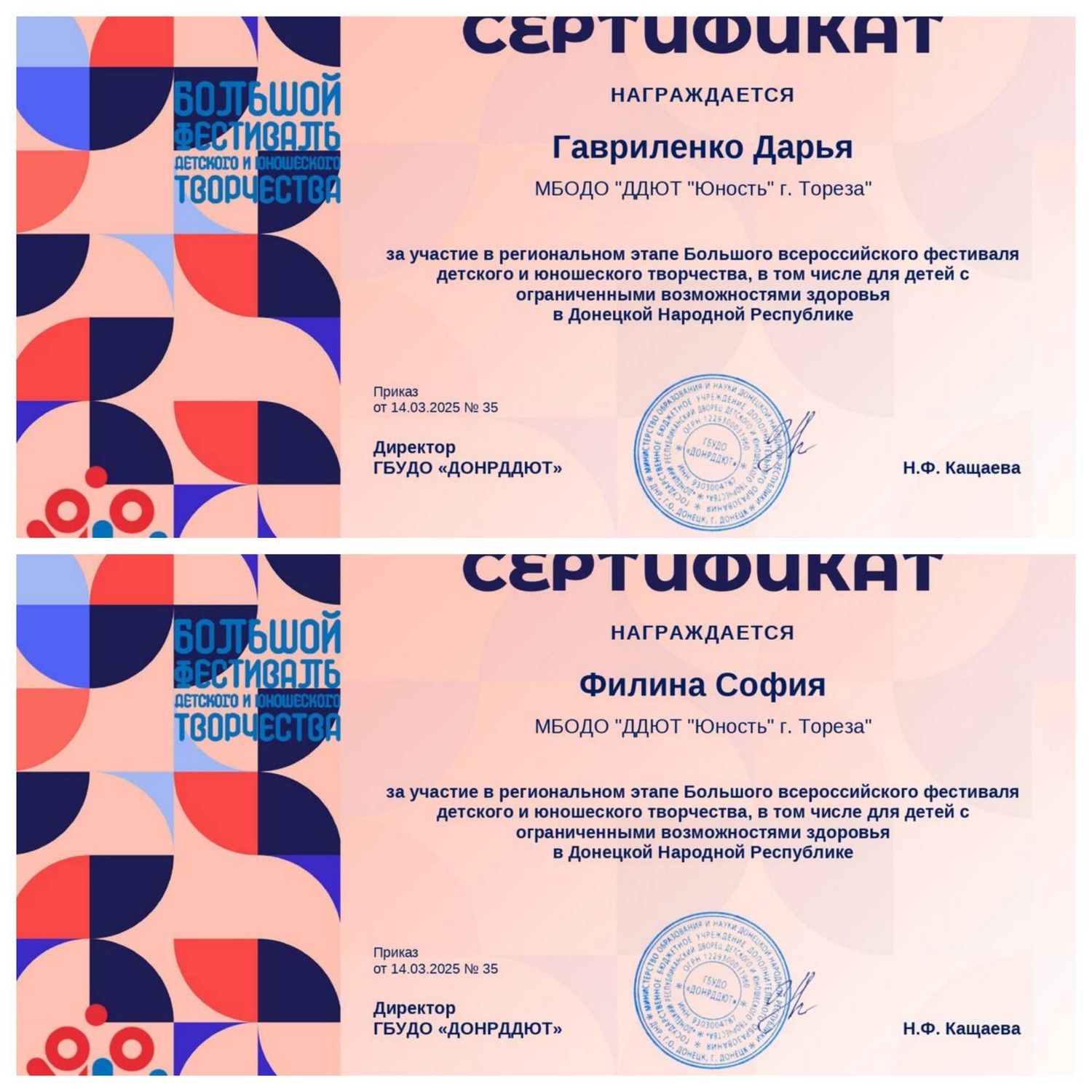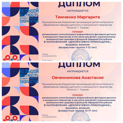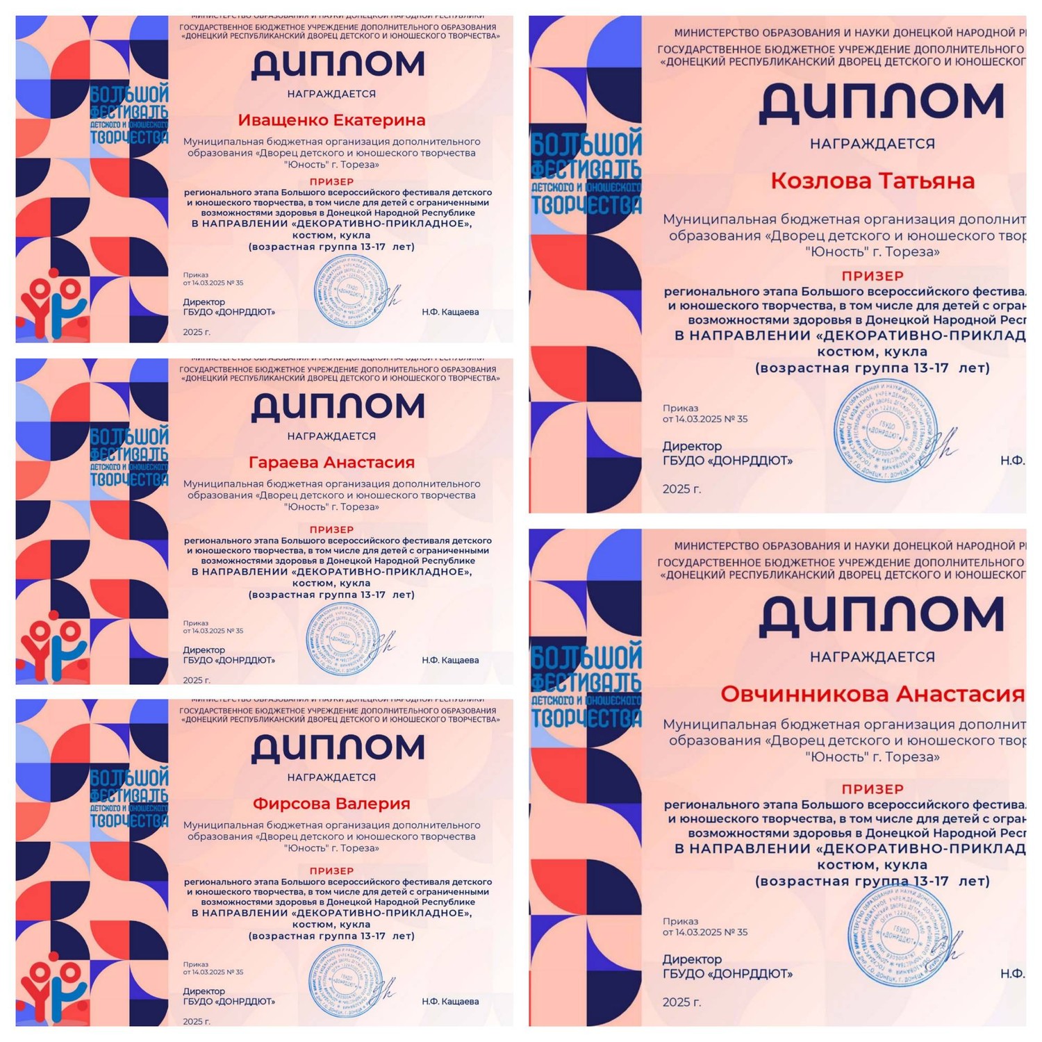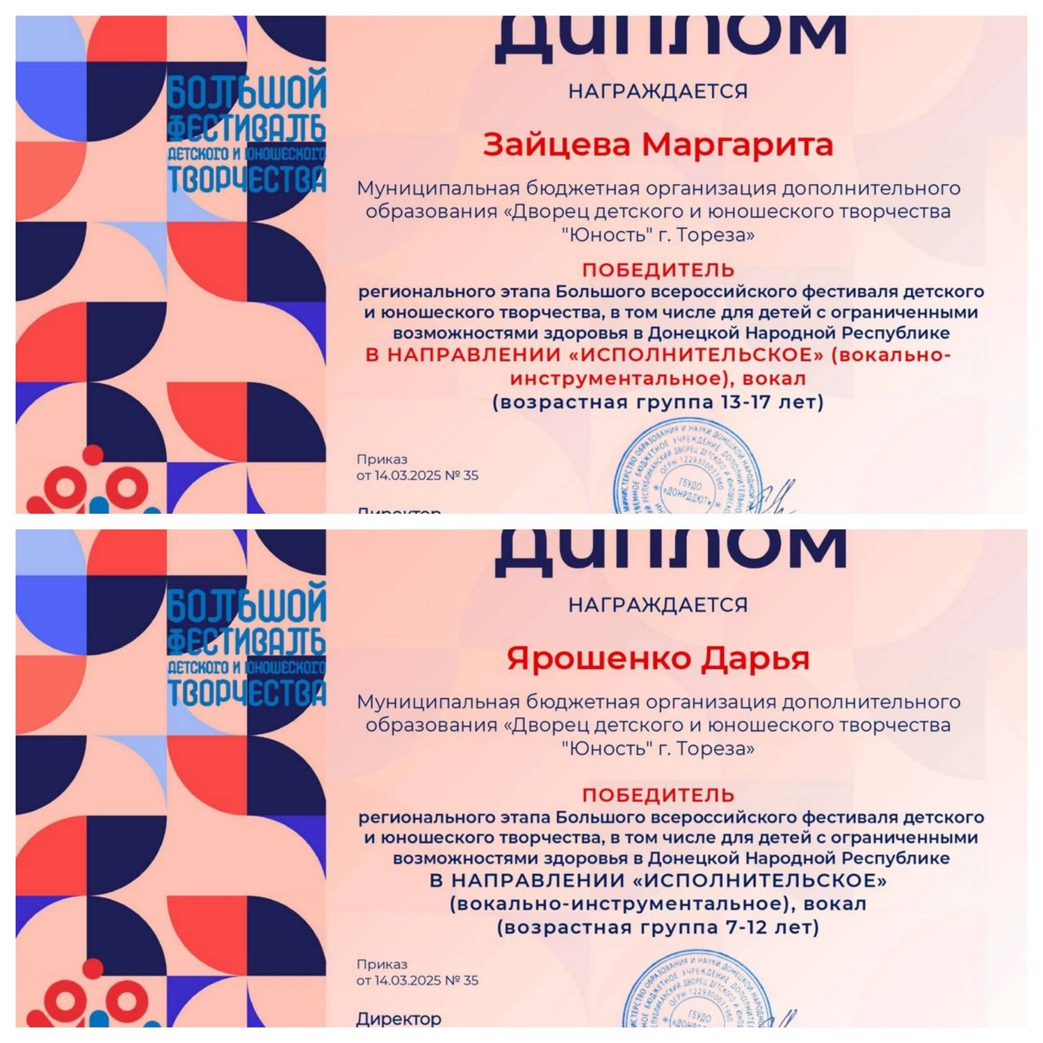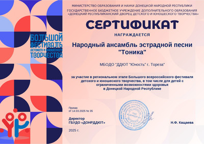 Наши итоги: - 4 победителя, 14 призёров и 5 сертификатов участников: Победители – Ярошенко Дарья и Зайцева Маргарита (народный ансамбль эстрадной песни «Тоника»), Рулик Мария (народный художественный коллектив «Рукодельница»), Константинова Яна (народный художественный коллектив "Волшебная ниточка") Призёры – Шевкаленко Мария и номер «Скакалки» (народный цирковой коллектив «Салют»); Овчинникова Анастасия и Коршикова Карина (ТО «Школа красоты»); «Дорогой добра» (вокальный ансамбль «Улыбка»); Серёгина Ульяна (ТО «Живопись и графика»); Тимченко Маргарита, Овчинникова Анастасия (ТО «Волшебная ниточка»); Иващенко Екатерина, Овчинникова Анастасия, Гараева Анастасия, Фирсова Валерия и Козлова Татьяна (ТО «Рукодельница»); «Журавли» (народный ансамбль современного танца «Баттерфляй»). Сертификаты участников: Филина София и Гавриленко Дарья (ТО «Салют); Бутвина Алина и Терихова Таисия(ТО «Живопись и графика». Народный ансамбль эстрадной песни "Тоника" | |