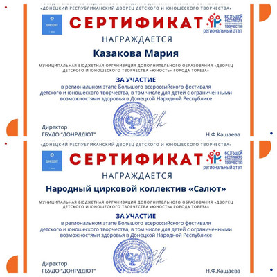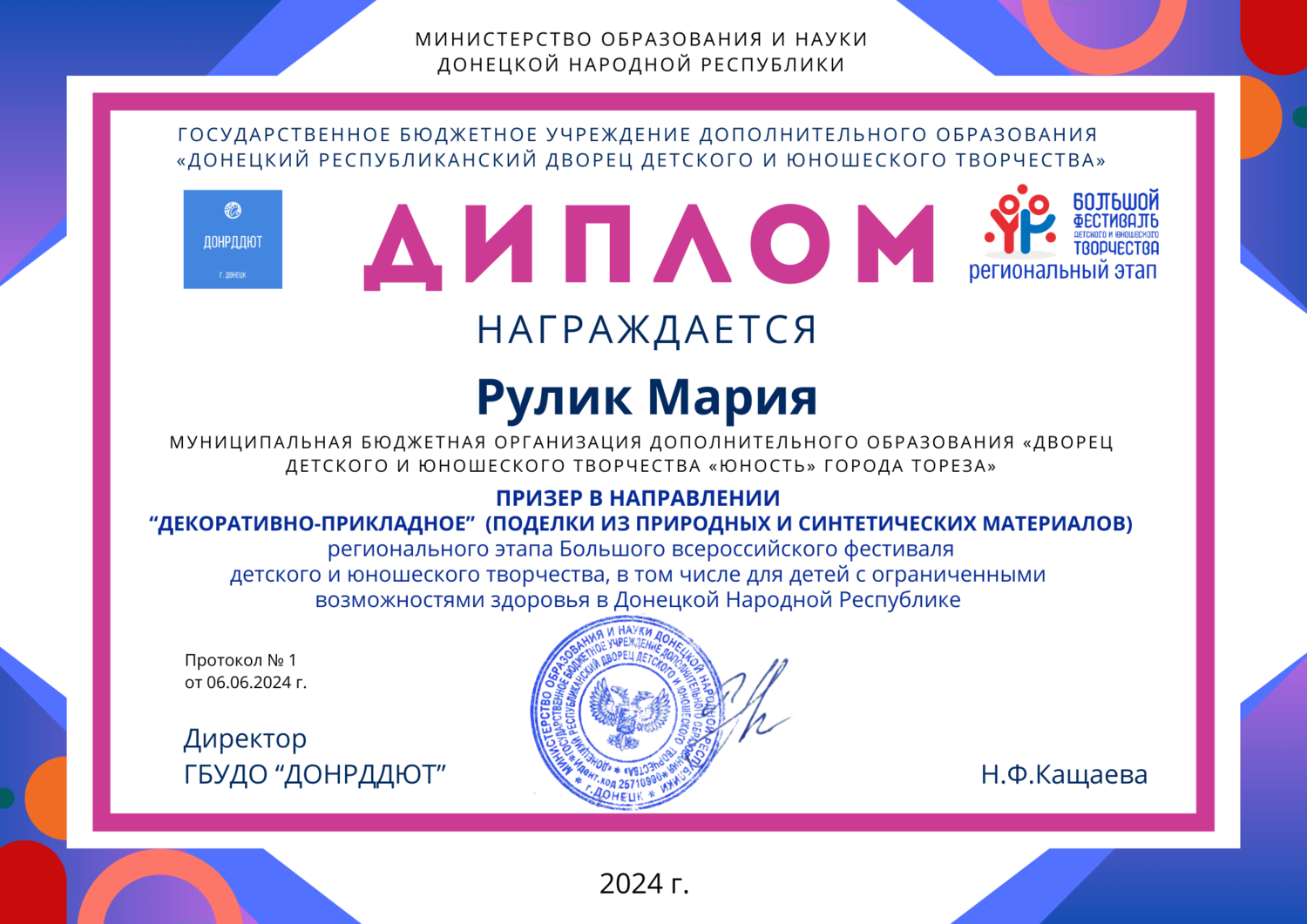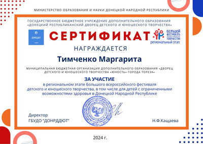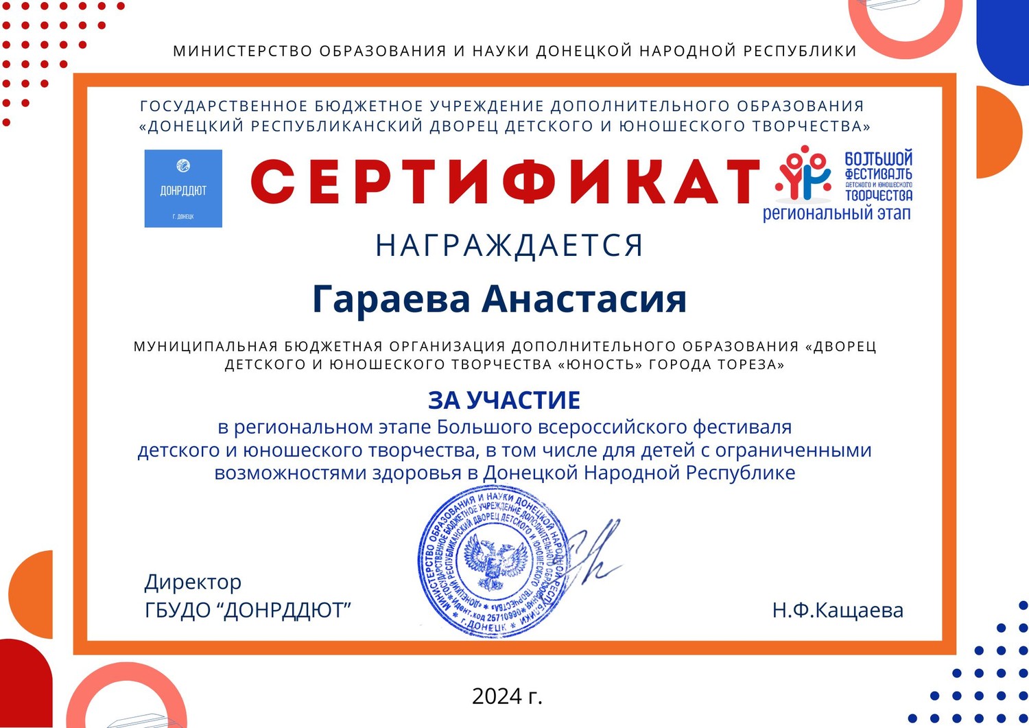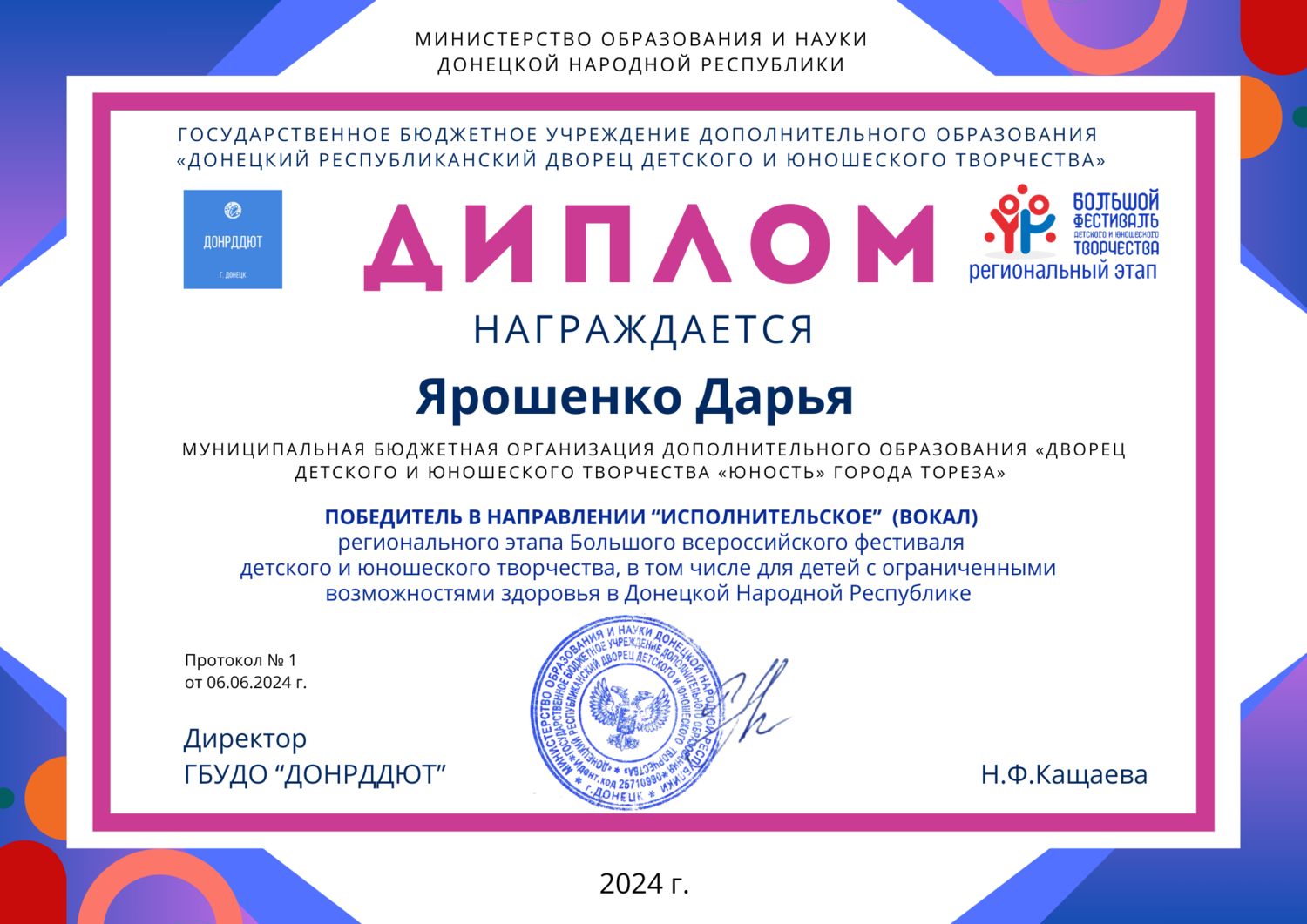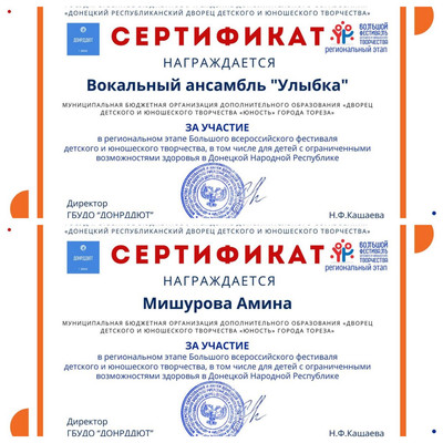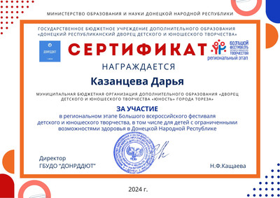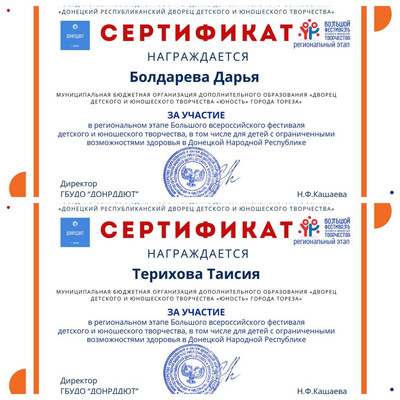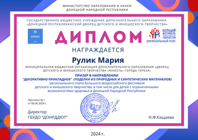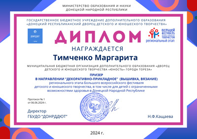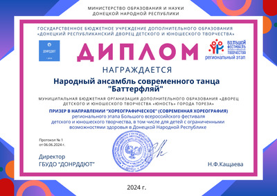 Поздравляем победителей, призёров и участников регионального этапа Большого всероссийского фестиваля детского и юношеского творчества, в том числе для детей с ОВЗ в Донецкой Народной Республике! Победители: - Гомонова Мария (образцовый художественный коллектив «Школа красоты», педагог Москалева Е.В.), - Ярошенко Дарья (народный ансамбль эстрадной песни «Тоника», педагог Гужель В.А.), - Селионова Алина (народный ансамбль эстрадной песни «Тоника», педагог Гужель В.А.), - народный ансамбль эстрадной песни «Тоника» (13-17 лет), педагог Гужель В.А. Призёры: - народный ансамбль современного танца «Баттерфляй» (педагог Степанова Ю.Э.), 7-12 лет, - народный ансамбль современного танца «Баттерфляй» (педагог Степанова Ю.Э.), 13-17 лет, - Иким Виктория (народный художественный коллектив «Школа красоты», педагог Москалева Е.В.), - Тимченко Маргарита (народный художественный коллектив «Волшебная ниточка», педагог Привалова Т.А.), - Овчинникова Анастасия (народный художественный коллектив «Волшебная ниточка», педагог Привалова Т.А.), - Рулик Мария (народный художественный коллектив «Рукодельница», педагог Дегтярева Е.Н.), - Панченко Иван (народный цирковой коллектив «Салют», педагоги Анна и Александр Гавриленко). Участники: - Болдарева Дарья и Терихова Таисия (народный художественный коллектив «Живопись и графика», педагог Даушева Е.В.), - Гараева Анастасия (народный художественный коллектив «Рукодельница», педагог Дегтярева Е.Н.), - Казанцева Дарья (народный ансамбль эстрадной песни «Тоника», педагог Гужель В.А.), - вокальный ансамбль «Улыбка» и Мишурова Амина (вокальный ансамбль «Улыбка», педагог Трофимова Л.А.), - Казакова Мария и народный цирковой коллектив «Салют» народный цирковой коллектив «Салют», педагоги Анна и Александр Гавриленко), - Тимченко Маргарита (народный художественный коллектив «Волшебная ниточка», педагог Привалова Т.А.). | |