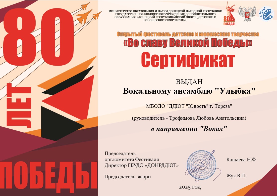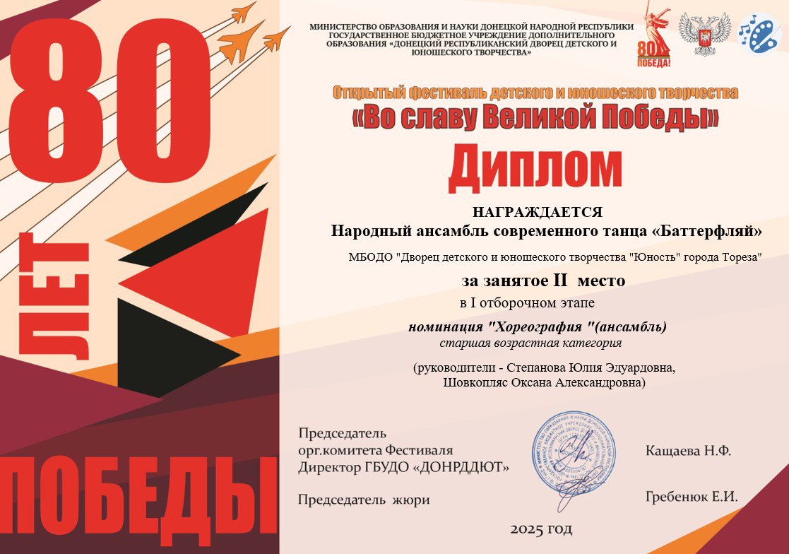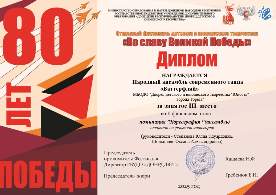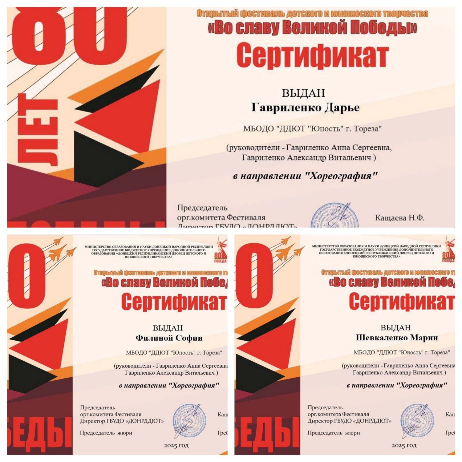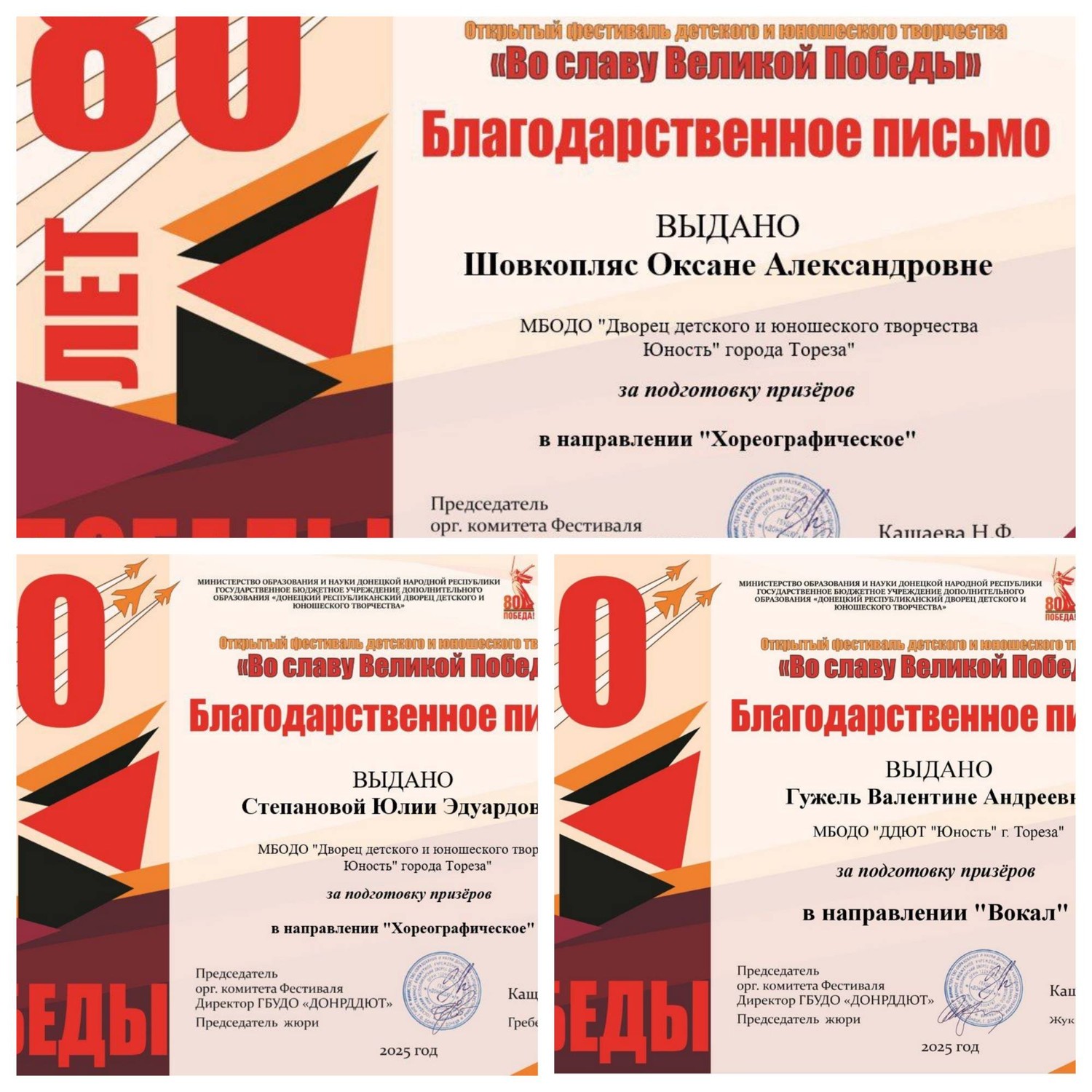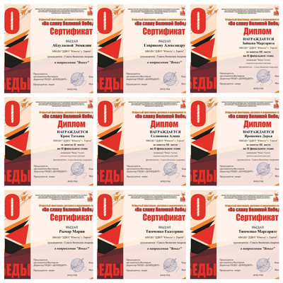Обучающиеся творческих коллективов награждены дипломами и сертификатами, а педагоги – благодарственными письмами за участие в Открытом фестивале детского и юношеского творчества «Во славу Великой Победы». Благодарственные письма – Степановой Ю.Э., Шовкопляс О.А., Гужель В.А. За занятое 2 место – народному ансамблю современного танца «Баттерфляй» (I отборочный этап), За занятое 3 место – народному ансамблю современного танца «Баттерфляй» (II финальный этап). Сертификаты участников: - вокальному ансамблю «Улыбка» (педагог Трофимова Л.А.), - солистам народного циркового коллектива «Салют» - Шевкаленко Марии, Гавриленко Дарье, Филиной Софии (педагог Анна и Александр Гавриленко), - солистам народного ансамбля эстрадной песни «Тоника» - Гаврикову Александру, Рымар Марии, Абдулаевой Эммилии, Селионовой Алине, Крюк Татьяне, Зайцевой Маргарите, Ярошенко Дарье, Тимченко Маргарите и Тимченко Екатерине (педагог Гужель В.А.). Молодцы! Поздравляем!