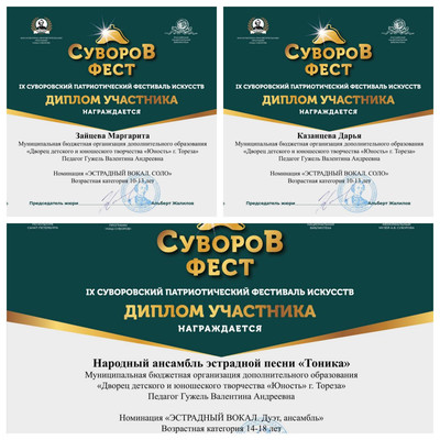 IХ Международный суворовский патриотический фестиваль искусств «Парад Петра Великого» проходил с июня по ноябрь 2022 года и был посвящен 350-летию со дня рождения российского императора, основателя Санкт-Петербурга Петра I. В фестивале приняли участие народный ансамбль эстрадной песни «Тоника» (педагог Гужель В.А.) и солисты ансамбля. Цель Фестиваля: Фестиваль предоставляет возможность молодым талантам внести свой творческий вклад в осмысление великой истории Российского государства. Задачи Фестиваля: - популяризация творчества в широком смысле этого слова, выявление одаренных исполнителей и коллективов; - формирование исторического сознания, ответственной жизненной позиции и верности культурным традициям России, воспитание художественного вкуса и приобщение молодых исполнителей и коллективов к лучшим образцам отечественной культуры и искусства; - культурное, эстетическое и историческое просвещение широкой аудитории (зрителей и гостей Фестиваля) в результате знакомства с классическими, традиционными и современными видами сценического искусства России, культурным наследием нашей страны, гражданско-патриотическими произведениями русских и российских поэтов, композиторов, авторов. Учредители Фестиваля: Государственный мемориальный музей А. В. Суворова Комитет по культуре Правительства СПб Российское военно-историческое общество Министерство по науке и высшему образованию РФ