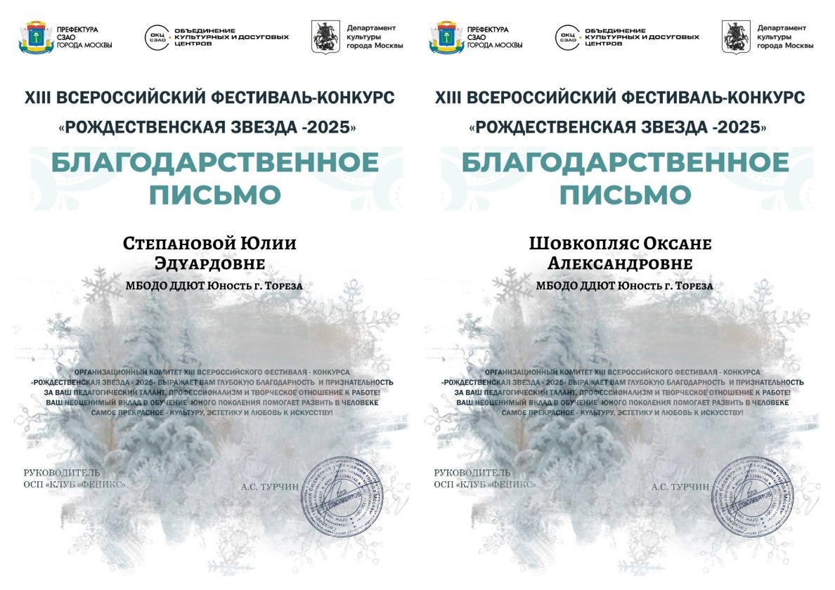 Получены дипломы за участие в XIII Всероссийском фестивале-конкурсе дебютного творчества «Рождественская звезда 2025» (г. Москва). Гран-при – «Скороговорилка» (педагог Степанова Ю.Э.) Лауреат 1 степени – «Побег из курятника» (педагог Степанова Ю.Э.) Лауреат 2 степени – «Кузнечик» (педагог Самарина К.В.) Лауреат 2 степени - «Стройка 2.0» (педагоги Анна и Александр Гавриленко) Дипломант 1 степени – шрр «Супер детки и «Развлечёба» (педагог Цымбаленко И.О.) Дипломант 3 степени – «Оркестр маленьких жучков» (педагог Степанова Ю.Э.). Педагоги Степанова Ю.Э. и Шовкопляс О.А. получили благодарственные письма за подготовку номера, получившего Гран-при! Поздравляем наших юных артистов! | |