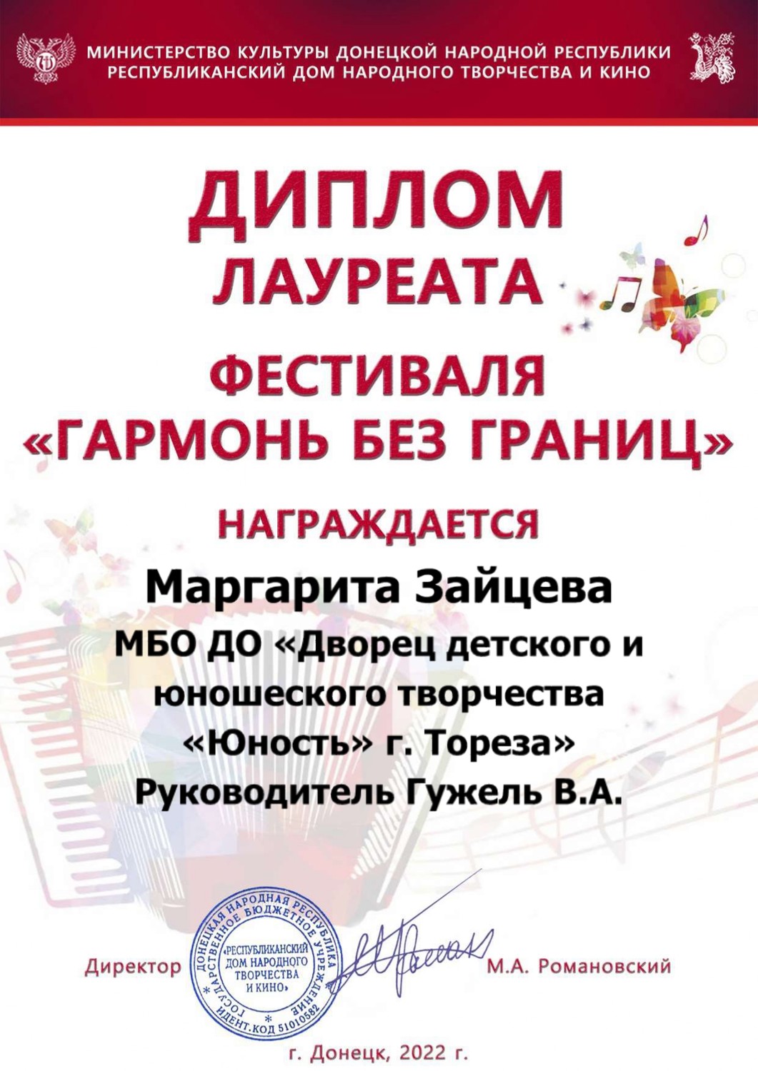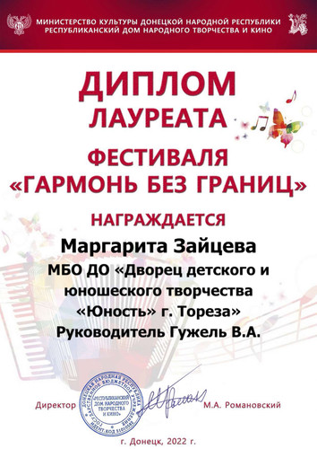 В сентябре-ноябре 2022 года ГБУ «Республиканский дом народного творчества и кино» проводился Фестиваль «Гармонь без границ», с целью пропаганды и сохранения народного музыкального исполнительства, искусства игры на гармони, баяне и других народных инструментах, выявления и поддержки самобытных, профессиональных исполнителей, творческих коллективов в рамках празднования Дня народного единства, в котором приняла участие солистка народного ансамбля эстрадной песни «Тоника» (педагог Гужель В.А.) МБОДО «ДДЮТ «Юность» Зайцева Маргарита. В Фестивале приняли участие солисты-вокалисты народной песни, фольклорные ансамбли, ансамбли и театры народной песни, гармонисты, баянисты, ансамбли и оркестры народных инструментов учреждений культуры и искусства из Донецкой Народной Республик и Российской Федерации независимо от ведомственной принадлежности. Программа Фестиваля включала себя исполнение народных песен, частушек, аранжировок народных песен, прославляющих силу духа русского народа, любовь к Родине и культуре. ГБУ «Республиканский дом народного творчества и кино» было принято около 100 заявок из городов и районов Донецкой Народной Республики (Донецк, Макеевка, Харцызск, Шахтёрск, Горловка, Снежное, Кировское, Зугрэс, Ждановка, Торез, Новоазовский и Амвросиевский районы) и областей Российской Федерации (Тульская, Липецкая, Орловская, Воронежская, Белгородская, Ленинградская, Саратовская, Рязанская, Астраханская). Маргарита стала лауреатом фестиваля! Поздравляем и желаем творческих побед! | |
