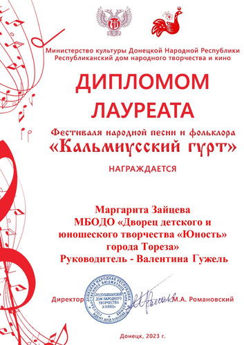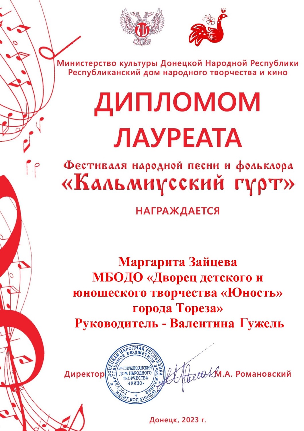 С 20 декабря 2022 года по 10 февраля 2023 года Государственным бюджетным учреждением «Республиканский дом народного творчества и кино» проводился Фестиваль народной песни и фольклора «Кальмиусский гурт». Фестиваль проводился с целью сохранения и пропаганды народной песни, развитию ансамблевого и хорового исполнительства, выявления и сохранения лучших образцов народной песенной культуры. В фестивале приняли участие творческие коллективы и солисты из Донецкой Народной Республики (г. Донецк, г. Макеевка, г. Шахтёрск, г. Торез, г. Снежное; Старобешевский, Тельмановский, Новоазовский, Першотравневый, Володарский, Волновахский районы), Луганской Народной Республики (г. Луганск, пгт. Белореченский Лутугинского района), Алтайского края, г. Астрахани, г. Брянска, Воронежской области, Волгоградской области, г. Екатеринбурга, Забайкальского края, Кемеровской области, Красноярского края, Курской области, Липецкой области, г. Москвы и Московской области, Новосибирской области, г. Оренбурга, Пермского края, г. Санкт-Петербурга и Ленинградской области, Саратовской, Смоленской, Тульской, Тюменской и Ярославской областей, г. Севастополя (Республика Крым), Чукотского Автономного округа. Лауреатами фестиваля стали 53 творческих коллектива и 22 солиста. Солистка народного ансамбля эстрадной песни «Тоника» (педагог Гужель В.А.) МБОДО «ДДЮТ «Юность» Зайцева Маргарита стала лауреатом фестиваля! Поздравляем! | |