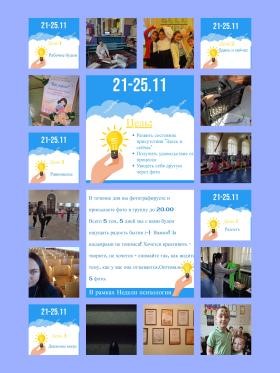С 21 по 25 ноября во дворце Юность в рамках акции Неделя психологии педагогом-психологом был проведен фото-челлендж. Главной целью данного мероприятия был поиск ресурса в нынешней сложной текущей ситуации. В течении дня педагогам надо было сделать несколько разноплановых фото, отражающих заданную тему.