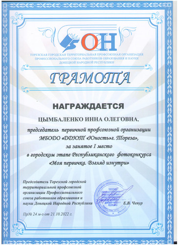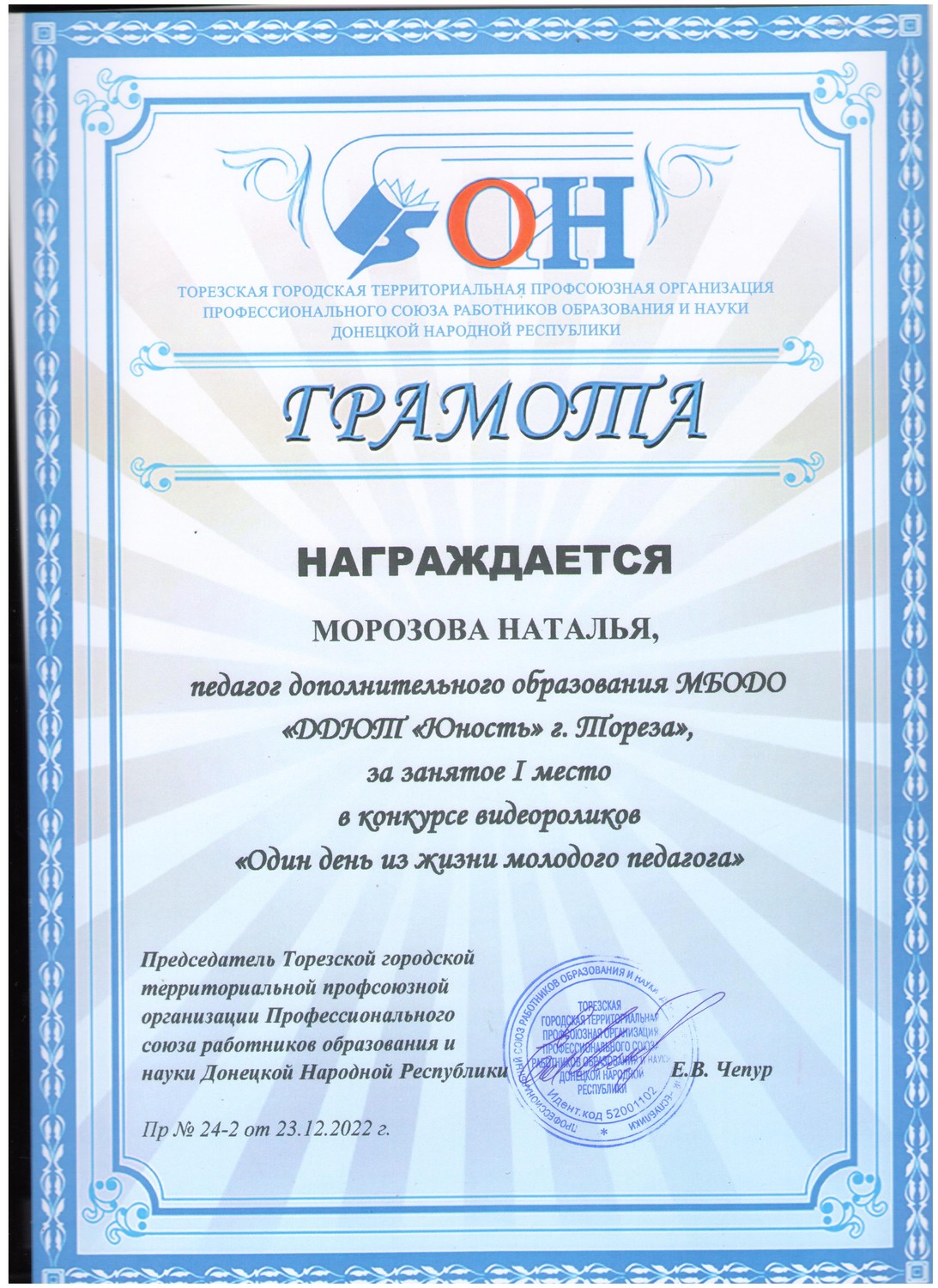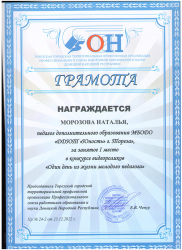 20 января состоялась III внеочередная конференция и заседание Совета Торезской городской территориальной профсоюзной организации профессионального союза работников образования и науки ДНР, на которой были вручены грамоты: Цымбаленко И.О. за занятое 1-е место в городском этапе Республиканского фотоконкурса «Моя первичка. Взгляд изнутри» и Морозовой Наталье Александровне за занятое 1-е место в конкурсе видеороликов «Один день из жизни молодого педагога». Поздравляем! | |