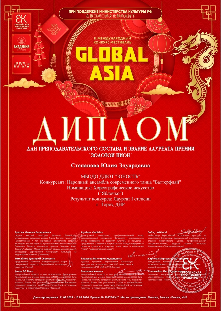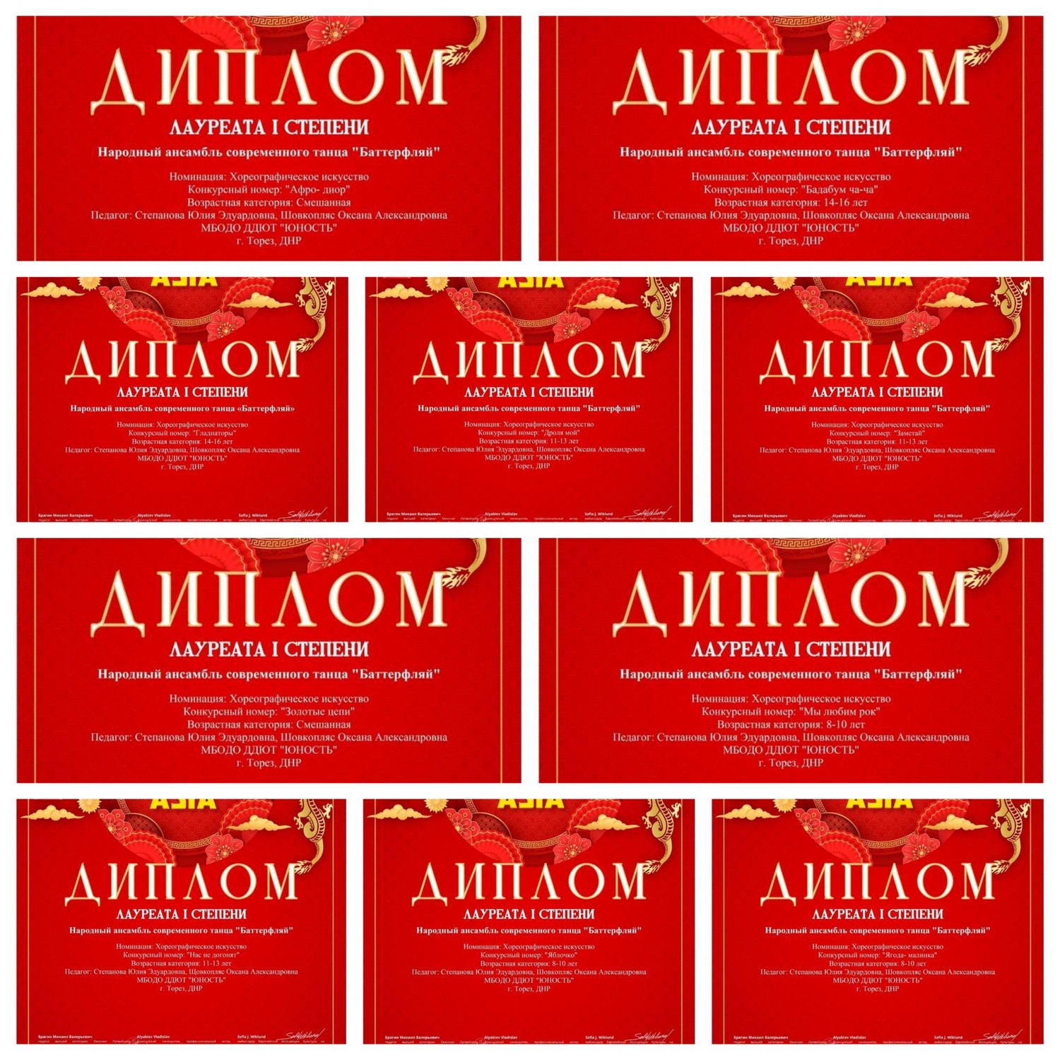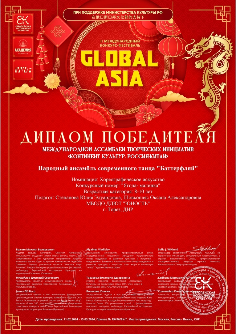 С 11.02.2024 г. по 15.03.2024 г. народный ансамбль современного танца "Баттерфляй"(педагог Степанова Ю.Э.) принял участие во II Международном конкурсе -фестивале в области культуры "Global Asia - 2024" (Китай). По итогам первой смены проекта наши ребята стали десятикратными Лауреатами Первой степени! Были представлены 10 различных танцевальных композиций в 6 возрастных категориях. Итоги конкурса: Лауреат I степени- композиция "Афро-диор" Лауреат I степени- композиция "Гладиаторы" Лауреат I степени- композиция "Бадабум ча-ча" Лауреат I степени- композиция "Заметай" Лауреат I степени- композиция "Дроля мой" Лауреат I степени- композиция "Нас не догонят" Лауреат I степени- композиция "Золотые цепи" Лауреат I степени- композиция "Яблочко" Лауреат I степени- композиция "Мы любим рок" Лауреат I степени- композиция "Ягода- малинка" Звание "Лауреата премии "Золотой пион" получила композиция Яблочко". Дипломом победителя Международной Ассамблеи творческих инициатив "Континент культур. Россия- Китай" награждена младшая группа за танец "Ягода- малинка". Руководителям ансамбля Степанова Ю.Э. и Шовкопляс О.А. вручены благодарственные письма. Поздравляем наших победителей! Прекрасное начало Весны! | |