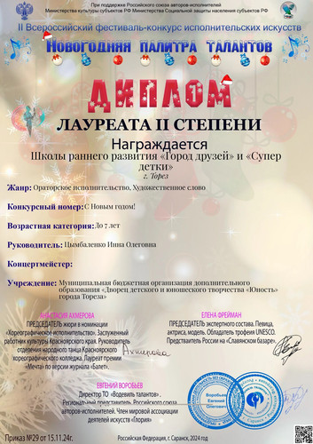 Обучающиеся школ раннего развития «Город друзей» и «Супер детки» приняли участие во II Всероссийский фестиваль-конкурс исполнительских искусств «Новогодняя палитра талантов» (г. Саранск). Конкурс проходил при поддержке Российского союза авторов-исполнителей, Министерства культуры субъектов РФ, Министерства Социальной защиты населения субъектов РФ. Цель Конкурса: Выявление одарённых детей, молодёжи и взрослых, поддержка лучших участников конкурса в дальнейшем творческом развитии. Содействие формированию эстетического вкуса в подборе репертуара. Поддержка лиц с ограниченными возможностями здоровья на всём этапе проведения фестивального действия. Задачи Конкурса: Раскрытие творческого потенциала Профессиональная оценка участников Повышение профессионального роста музыкального и художественного потенциала Совершенствование уровня исполнительского мастерства Способствовать формированию интереса и приобщению к культуре Поддержка и помощь людям с ограниченными возможностями здоровья. В номинации «Художественное слово» с номером «С Новым годом!» малыши стали лауреатами 2-ой степени! Поздравляем! Молодцы!