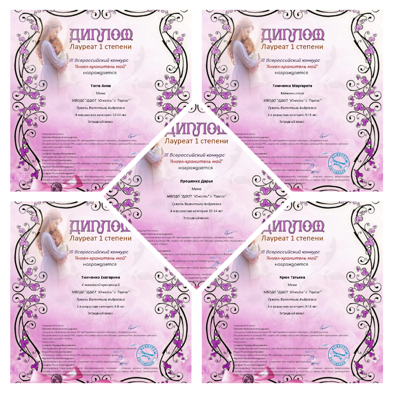 Солистки народного ансамбля эстрадной песни «Тоника» (педагог Гужель В.А.) приняли участие в III Всероссийском конкурсе «Ангел - хранитель мой» (Воронежская область) и стали победительницами конкурса! 1 место – Тимченко Маргарита, Тимченко Екатерина Тюпа Анна, Крюк Татьяна, Ярошенко Дарья. Руководитель награждена благодарственным письмом. Поздравляем! Молодцы!