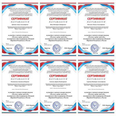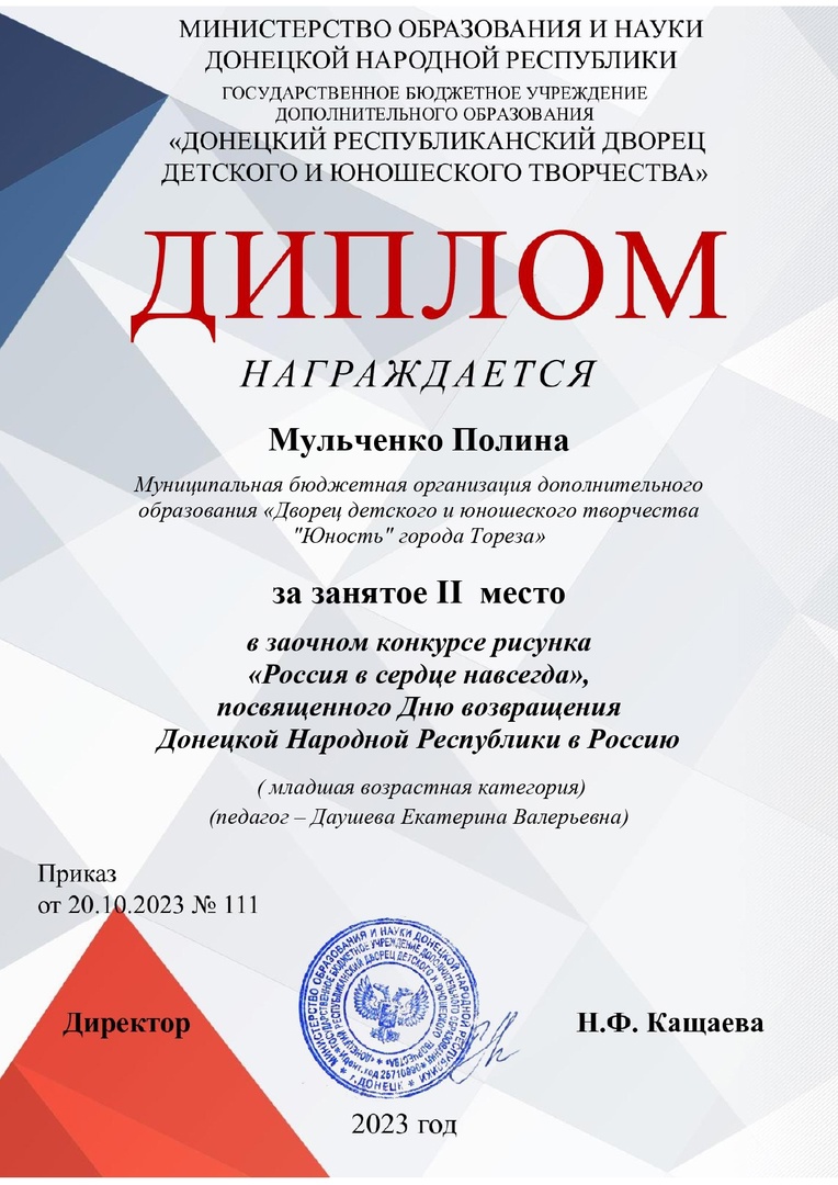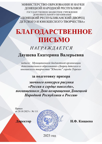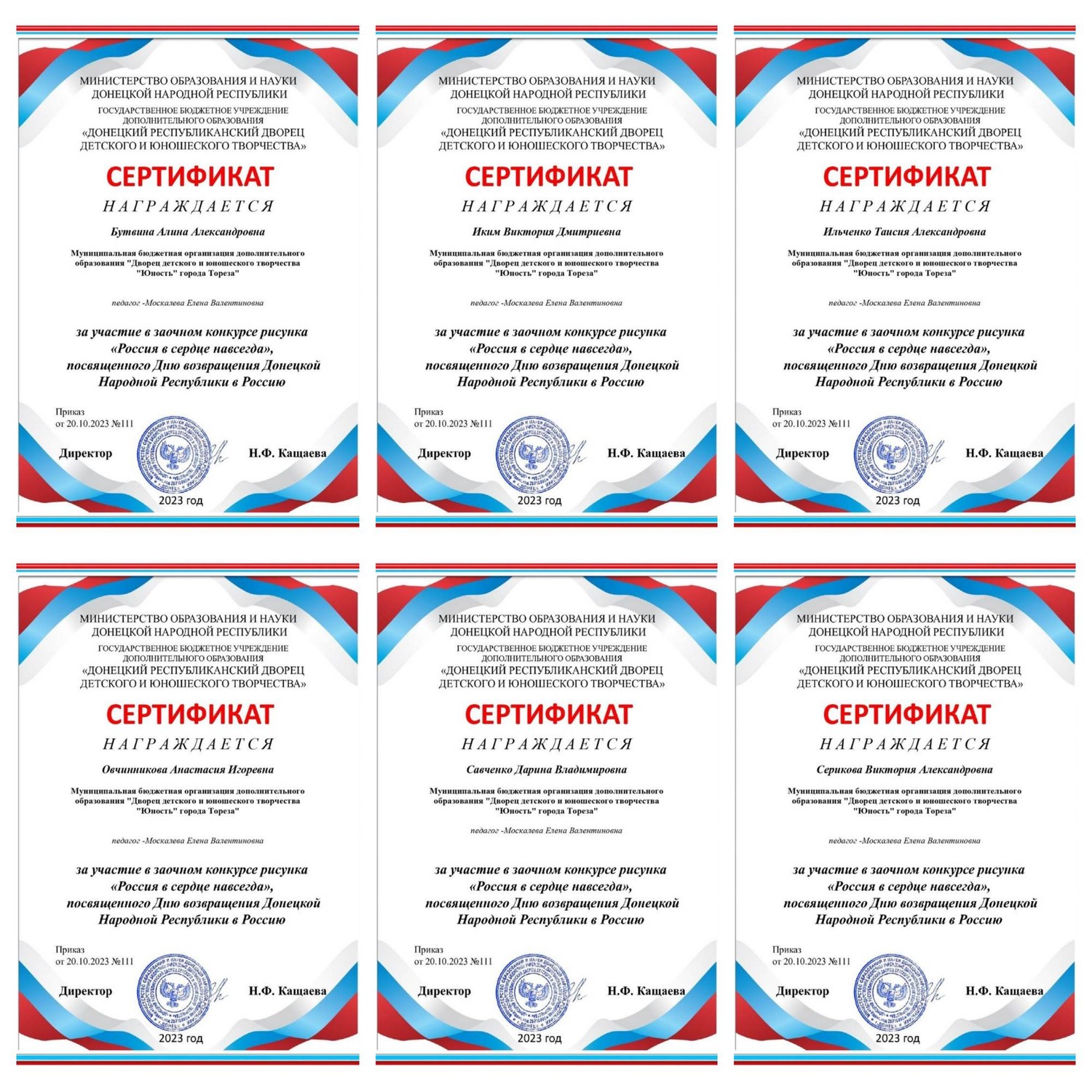 Подведены итоги конкурса рисунка «Россия в сердце навсегда», в котором приняли участие обучающиеся ТО МБОДО «ДДЮТ «Юность». Творческое мероприятие было приурочено ко Дню возвращения Донецкой Народной Республики в Россию. Около 900 участников – школьников, обучающихся организаций дополнительного образования, специальных школ-интернатов из городов и районов Республики приняли участие в конкурсе. Наши результаты: 2-е место – Мульченко Полина (народный художественный коллектив «Живопись и графика», педагог Даушева Е.В.). Педагог награждена благодарственным письмом за подготовку призёра конкурса. 6 сертификатов участников – Иким Виктория, Ильченко Таисия, Бутвина Алина, Серикова Виктория, Овчинникова Анастасия и Савченко Дарина (образцовый художественный коллектив «Школа красоты», педагог Москалева Е.В.). От всей души благодарим всех участников конкурса и желаем вдохновения и новых творческих побед! | |