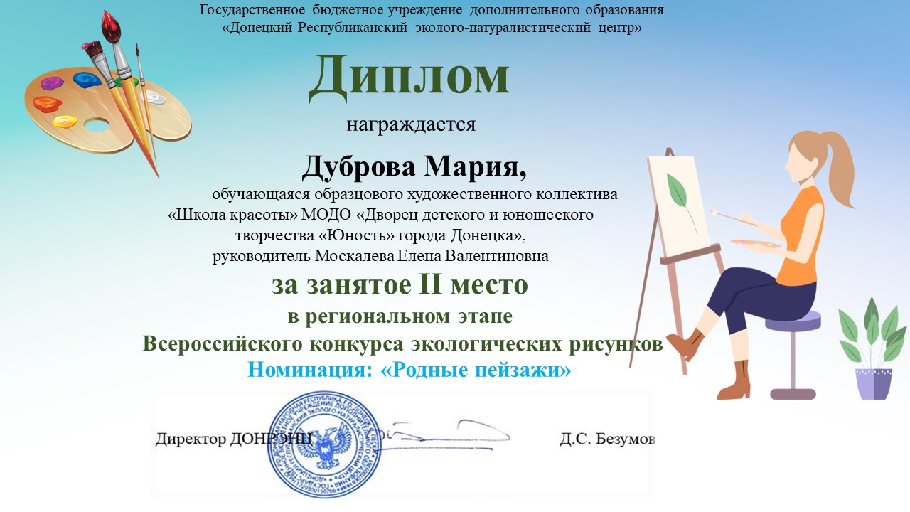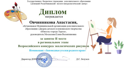 Обучающиеся образцового художественного коллектива «Школа красоты» (педагог Москалева Е.В.) и народного художественного коллектива «Живопись и графика» (педагог Даушева Е.В.) приняли участие в муниципальном и региональном этапе Всероссийского конкурса экологических рисунков целью привлечения внимания детей и молодежи к проблемам сохранения окружающей среды, формирования экологически грамотного стиля жизни и повышения уровня экологической культуры, усиления роли художественного творчества как средства экологического и гражданско-патриотического воспитания Итоги муниципального этапа: 1-е место - Овчинникова Анастасия, номинация «Заповедные уголки родного края» (ТО «Школа красоты»), 1 место – Дуброва Мария, номинация «Родные пейзажи» (ТО «Школа красоты»), 2-е место – Манушенко Анастасия, номинация «Мир воды» (ТО «Школа красоты»), 2-е место – Слободзян София, номинация «Мы в ответе за тех, кого приручили» (ТО «Школа красоты»), 2 место – Коршикова Карина, номинация «Мы за здоровый образ жизни!» (ТО «Школа красоты»), 3-е место – Бутвина Алина, номинация «Мир воды» (ТО «Живопись и графика»). В региональном этапе конкурса приняли участие обучающиеся образовательных организаций Донецкой Народной Республики от 5 до 18 лет в 4-х возрастных категориях, в оргкомитет поступило 444 работы. Итоги регионального этапа: 2-е место – Овчинникова Анастасия, 2-е место – Дуброва Мария. Благодарим вас, ребята, за ваше неравнодушие к экологическим проблемам, активную жизненную позицию, творчество, за ваши рисунки, наполненные любовью к природе! Благодарим вас, уважаемые педагоги, за развитие способностей учеников! Поздравляем! | |