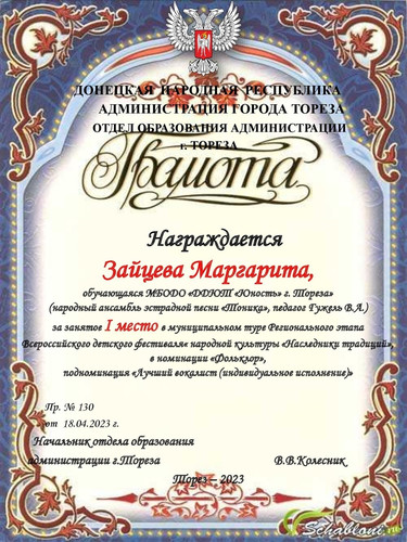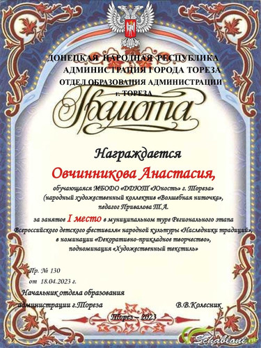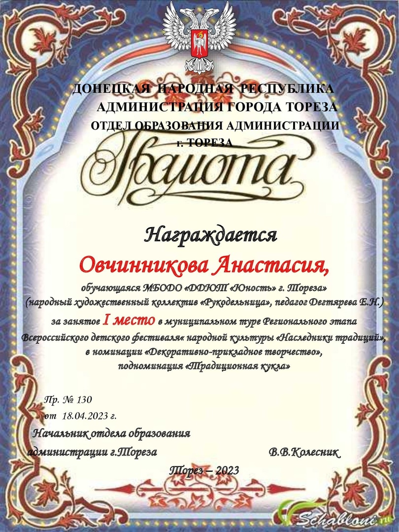 Подведены итоги муниципального тура регионального этапа Всероссийского детского фестиваля народной культуры «Наследники традиций». Победителями стали: - Зайцева Маргарита, обучающаяся народного ансамбля эстрадной песни «Тоника», педагог Гужель В.А,; - Овчинникова Анастасия, обучающаяся народного художественного коллектива «Волшебная ниточка», педагог Привалова Т.А.; - Овчинникова Анастасия, обучающаяся народного художественного коллектива «Рукодельница», педагог Дегтярева Е.Н. Поздравляем!