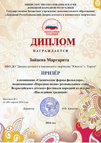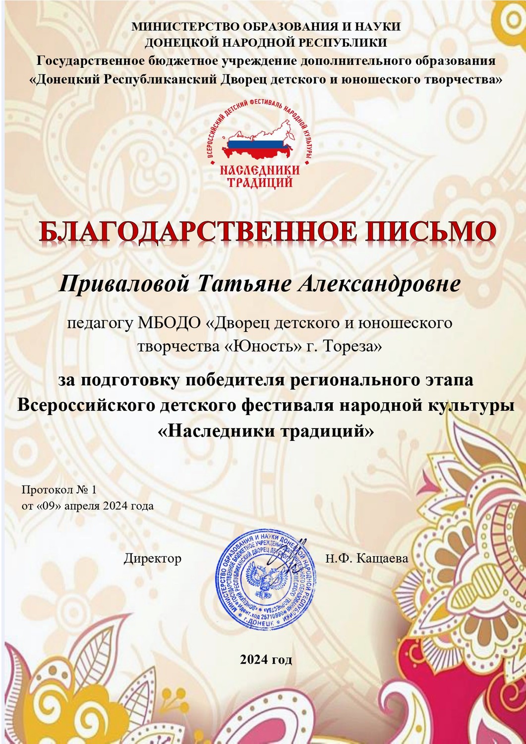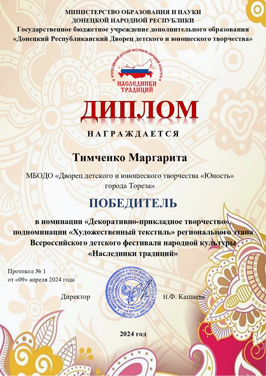 Подведены итоги регионального этапа Всероссийского детского фестиваля народной культуры «Наследники традиций» в Донецкой Народной Республике Участие в муниципальном этапе приняли 246 детей из образовательных организаций 12 городских и муниципальных округов ДНР: Амвросиевского, Горловки, Донецка, Макеевки, Снежного, Тореза, Докучаевска, Енакиево, Волновахского, Мангушского, Старобешевского и Шахтёрского округов. Ребята показали свое мастерство в различных видах народного творчества, представив яркие красочные работы в номинациях: «Фольклор», «Сценические формы фольклора», «Декоративно-прикладное творчество», «Народный костюм», «О своем о родном. Краткий метр» и «Традиционное судостроение». 49 лучших конкурсных работ и номеров победителей и призеров муниципального этапа стали участниками регионального этапа Фестиваля. Призёры конкурса - Зайцева Маргарита (народный ансамбль эстрадной песни "Тоника") и Гараева Анастасия (народный художественный коллектив "Рукодельница"). По итогам работы компетентного жюри регионального этапа конкурсные работы 22 участников, набравшие максимальное количество баллов направляются для участия в отборочном (заочном) туре федерального этапа Всероссийского детского фестиваля народной культуры «Наследники традиций». Тимченко Маргарита, обучающаяся народного художественного коллектива «Волшебная ниточка» (педагог Привалова Т.А.), со своей работой «Тыквенная история» примет участие в заочном туре фестиваля. Педагог Привалова Т.А. награждена благодпрственным письмом за подготовку победителя конкурса.