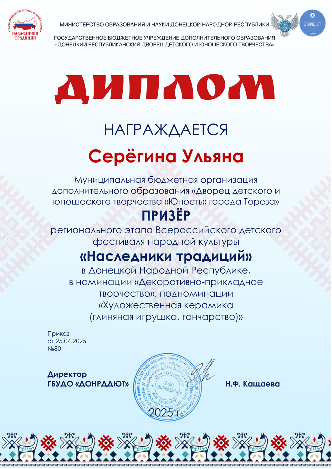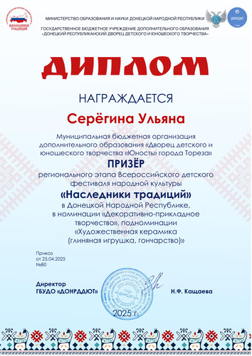 Подведены итоги регионального этапа Всероссийского детского фестиваля народной культуры «Наследники традиций» в Донецкой Народной Республике. Около 200 юных талантов, вдохновленных богатым наследием предков, представили свои работы в различных направлениях: «Фольклор», «Сценические формы фольклора», «Декоративно-прикладное творчество», «О своем, о родном. Краткий метр». Серёгина Удьяна, обучающаяся народного художественного коллектива «Живопись и графика» (педагог Даушева Е.В) стала призёром конкурса. Выражаем благодарность всем участникам, их родителям и наставникам за талант, старания и преданность культуре и искусству, воплощение своих идей через народное творчество! | |