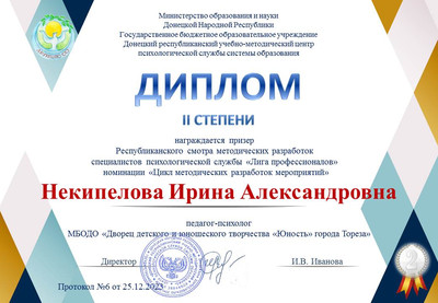 Подведены итоги Республиканского конкурса методических разработок специалистов психологической службы «Лига профессионалов – 2023», в котором приняла участие педагог-психолог МБОДО «ДДЮТ «Юность» Некипелова И.А. В номинации «Цикл методических разработок мероприятий» Ирина Александровна получила диплом 2-ой степени! Поздравляем! | |