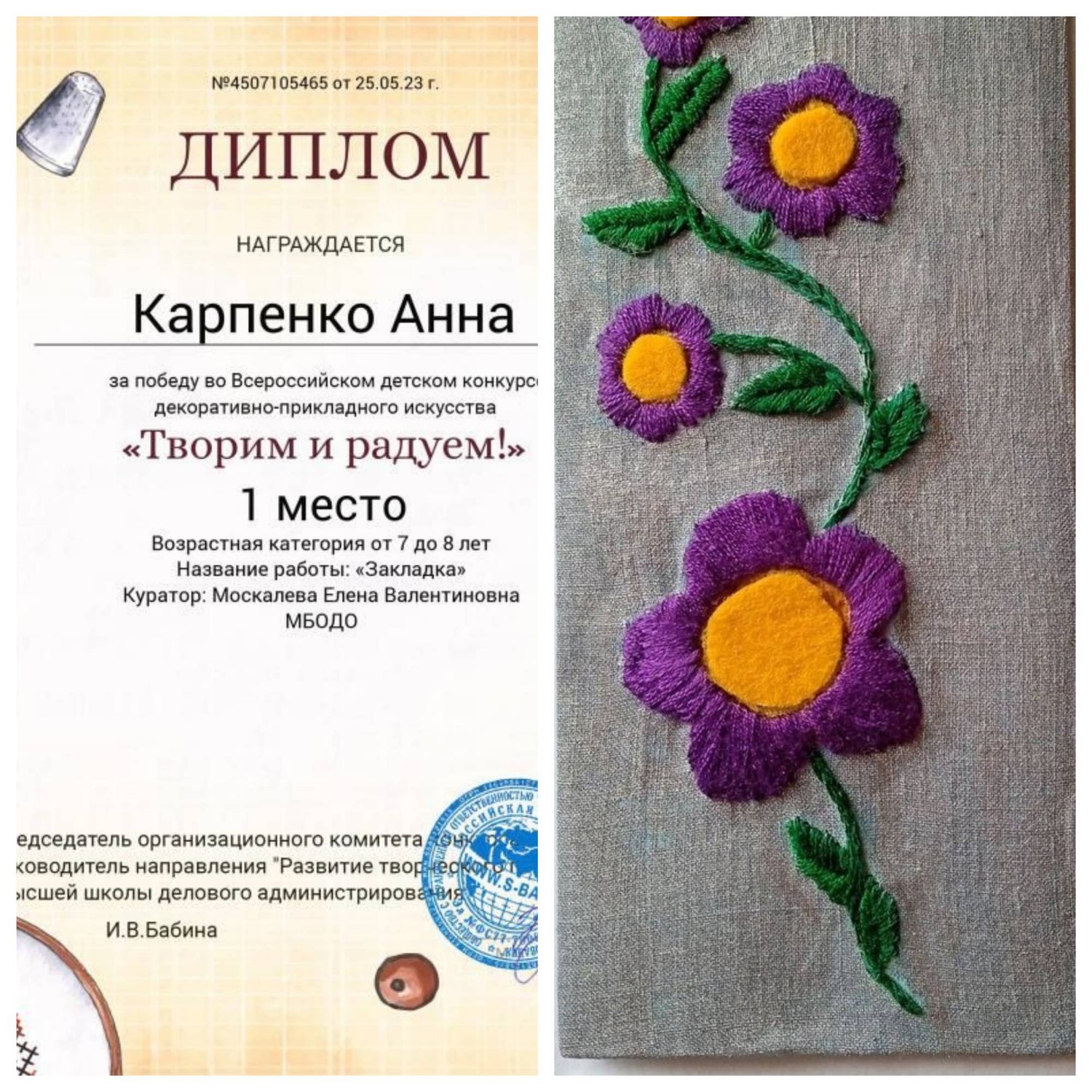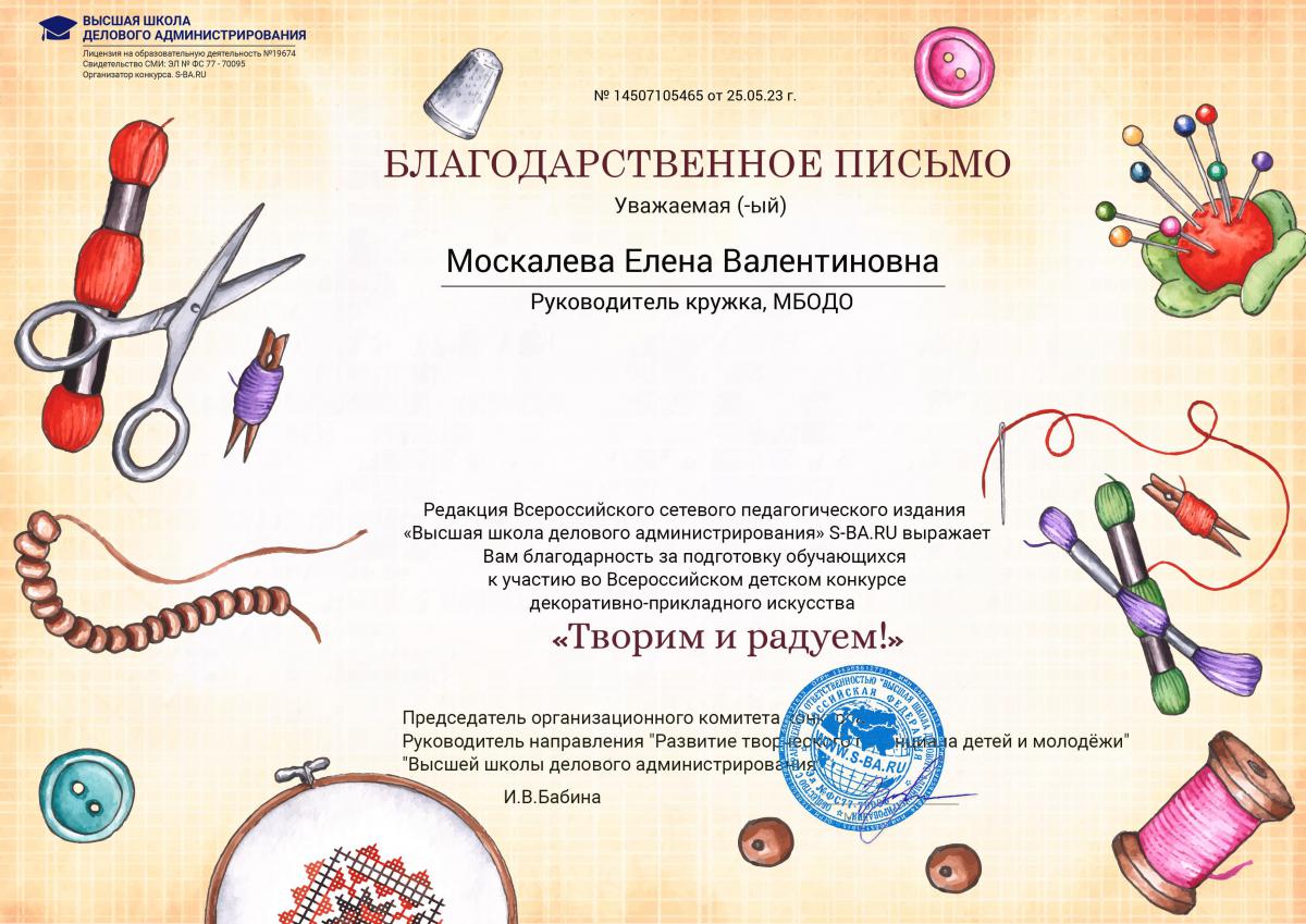 С 19 по 24 мая обучающаяся образцового художественного коллектива «Школа красоты» (педагог Москалева Е.В.) Карпенко Анна приняла участие во Всероссийском детском конкурсе декоративно-прикладного искусства «Творим и радуем!» (г. Екатеринбург). Организатор конкурса: Высшая школа делового администрирования. Могут руки людей сделать чудо любое: И по белому полю можно выткать цветы, И по синему небу вышить солнце златое, Чтобы стало чуть больше на земле красоты! Рукоделие и творчество – процесс, в результате которого можно создать своими руками что-то оригинальное, самобытное и даже полезное. Также это замечательный способ релаксации, тренировка внимания и усидчивости. Чтобы создать какую-либо поделку, необходимо выбрать в каком виде декоративно-прикладного искусства вы хотите работать. А видов этих – вагон и маленькая тележка. Поэтому мы предлагаем вам окунуться в мир рукоделия и творчества! Результаты конкурса – первое место! Педагог награждена благодарственным письмом. Поздравляем и желаем творческих успехов!