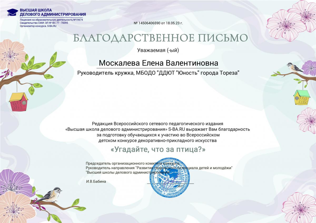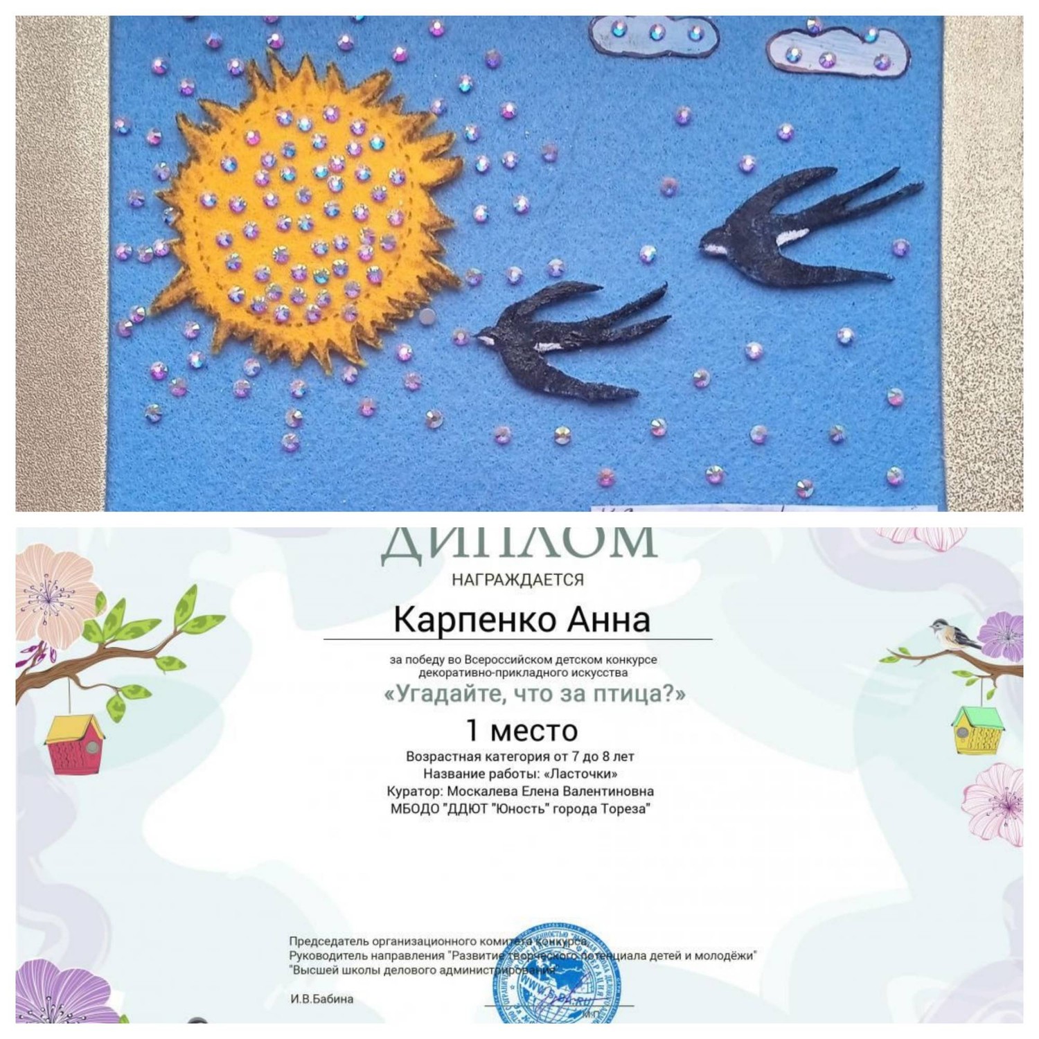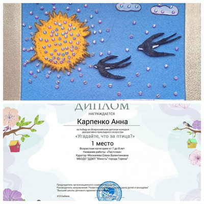 С 12 по 17 мая обучающаяся образцового художественного коллектива «Школа красоты» (педагог Москалева Е.В.) Карпенко Анна приняла участие во Всероссийском детском конкурсе декоративно-прикладного искусства «Угадайте, что за птица?» (г. Екатеринбург). Организатор конкурса: Высшая школа делового администрирования. Тёплый период поздней весны – это время, когда покинувшие холодные края перелётные птицы возвращаются обратно. Самыми первыми, ещё в конце марта, с зимовки возвращаются грачи. Считается, что только в этот период весна по-настоящему вступает в свои права. Есть даже специальный праздник – всемирный день мигрирующих птиц, который отмечается 10 мая. Дата выбрана неспроста, ведь подавляющее большинство перелётных птиц прилетают в родные края именно в этот период. Это и зяблики, и жаворонки, и дрозды, и горихвостки, и даже чайки! Список можно продолжать и продолжать, ведь мигрирующих птиц – несчётное количество. Результаты конкурса – первое место! Педагог награждена благодарственным письмом. Поздравляем и желаем творческих успехов! | |