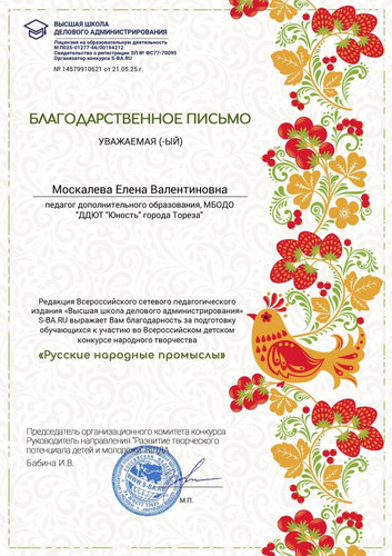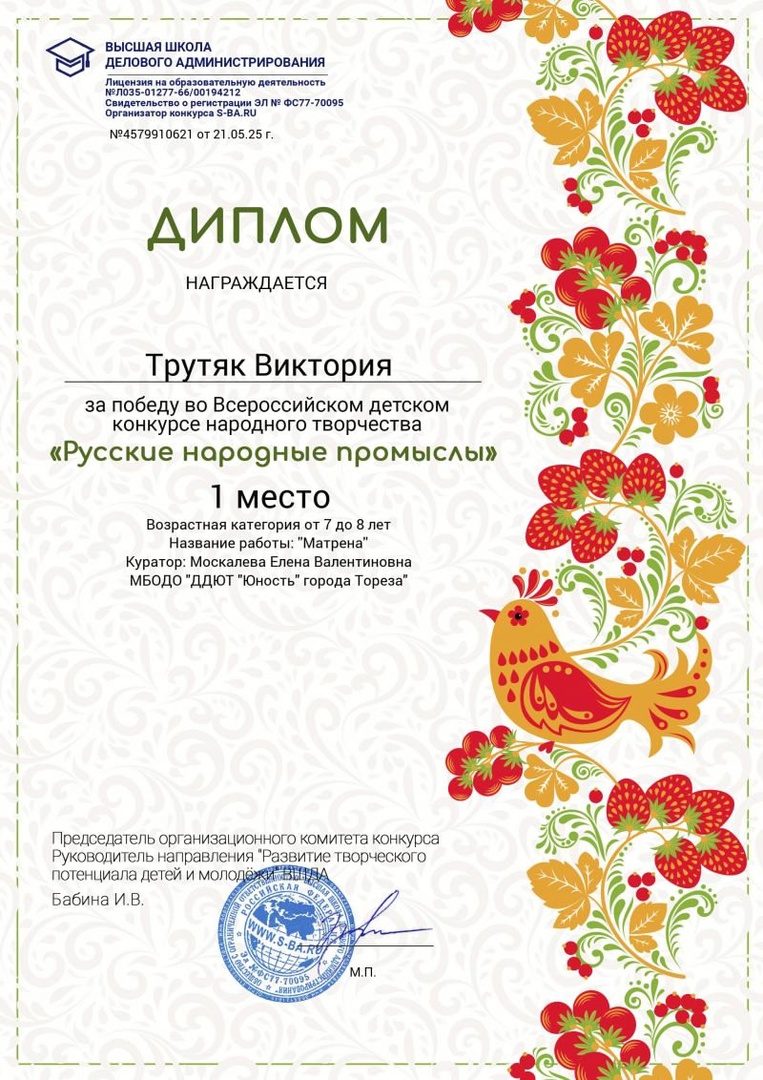 Обучающаяся образцового художественного коллектива «Школа красоты» (педагог Москадева Е.В.) Трутяк Виктория приняла участие во Всероссийском детском конкурсе народного творчества «Русские народные промыслы» и стала победителем! Педагог награждена благодарственным письмом. Поздравляем с заслуженной победой!