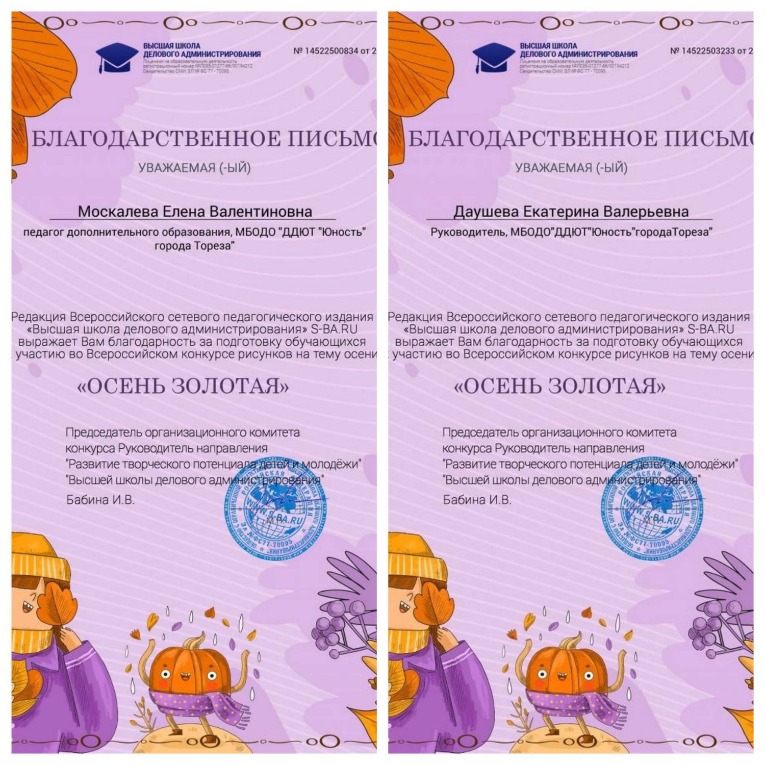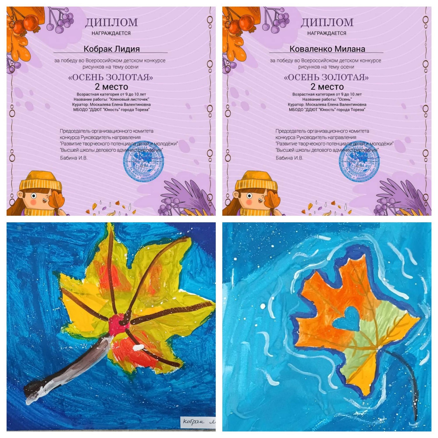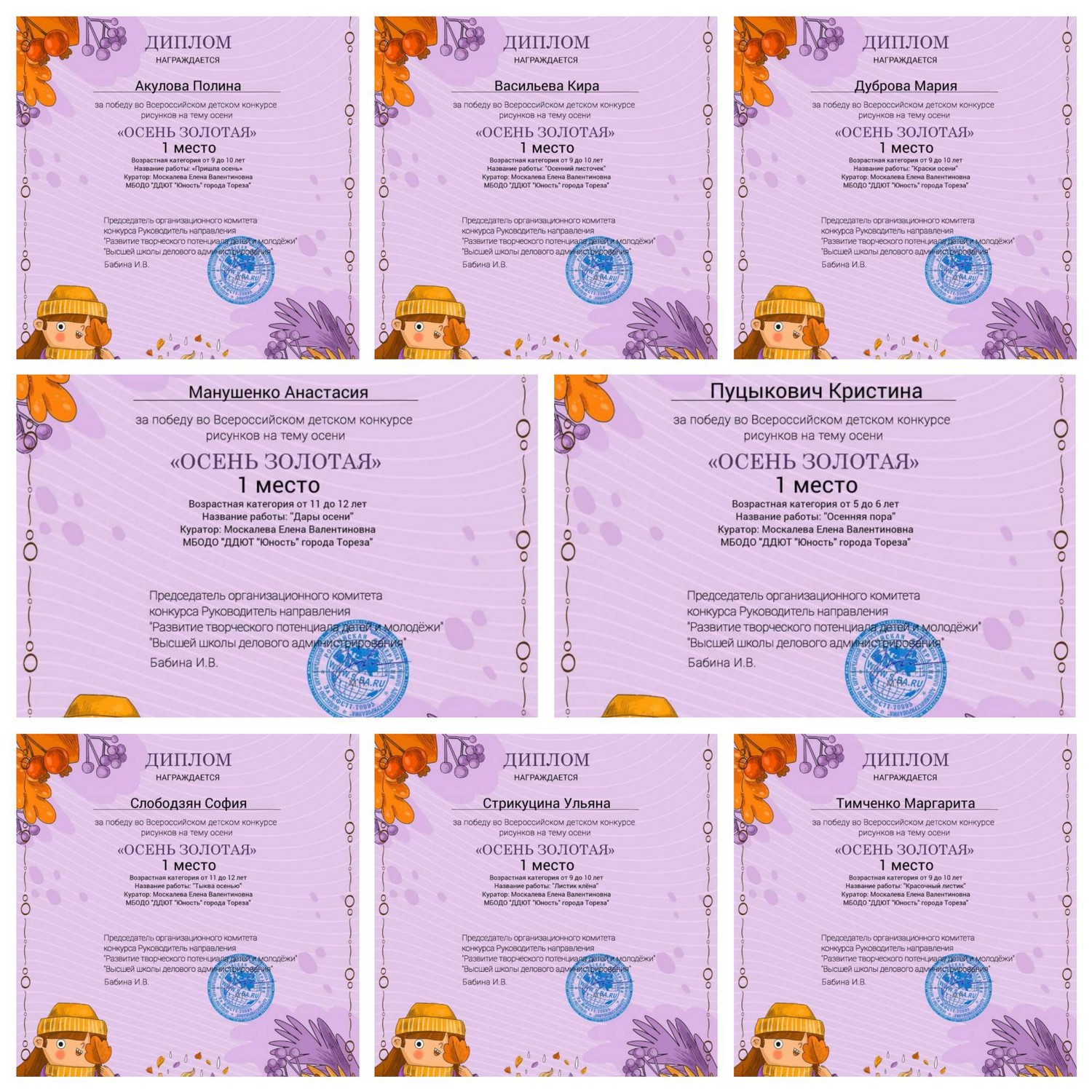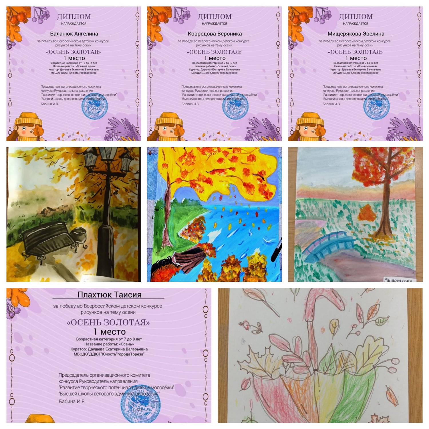С 19 по 24 октября обучающиеся МБОДО «ДДЮТ «Юность» приняли участие во Всероссийском детском конкурсе рисунков на тему осени «Осень золотая». Основные цели и задачи Конкурса: • всестороннее содействие развитию детского изобразительного и декоративно-прикладного творчества; • предоставление участникам возможности в состязательной форме развить и продемонстрировать свои творческие способности; • воспитание бережного отношения к природе. Итоги конкурса: Народный художественный коллектив «Живопись и графика» (педагог Даушева Е.В.) – 4 первых места: 1-е места – Баланюк Ангелина, Ковредова Вероника, Мищерякова Эвелина, Плахтюк Таисия. Образцовый художественный коллектив «Школа красоты» (педагог Москалева Е.В.) – 14 первых и 2 вторых места: 1-е места – Быкадорова Варвара, Акулова Полина, Бутвина Алина, Васильева Кира, Дуброва Мария, Коршикова Карина, Манушенко Анастасия, Полторацкая Дарья, Пунтус Юлия, Пуцыкович Кристина, Слободзян София, Стрикуцина Ульяна, Татар Ангелина, Тимченко Маргарита.
