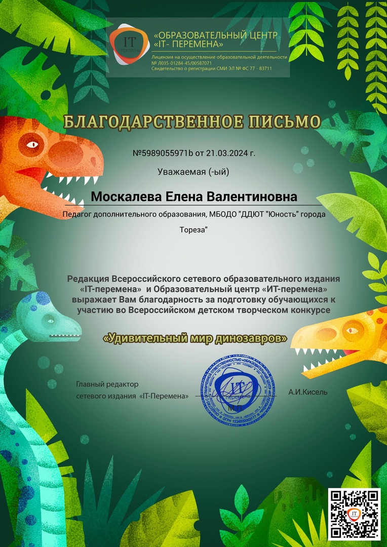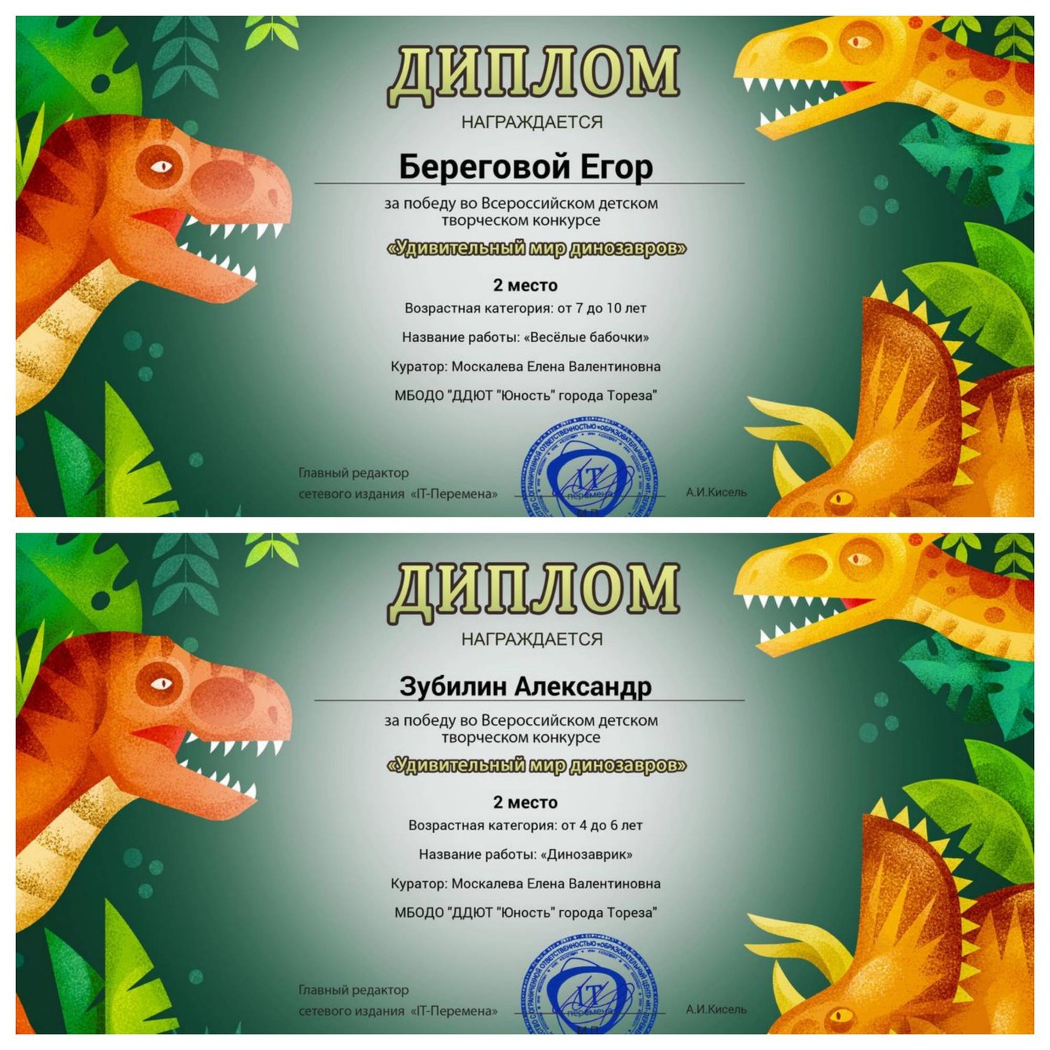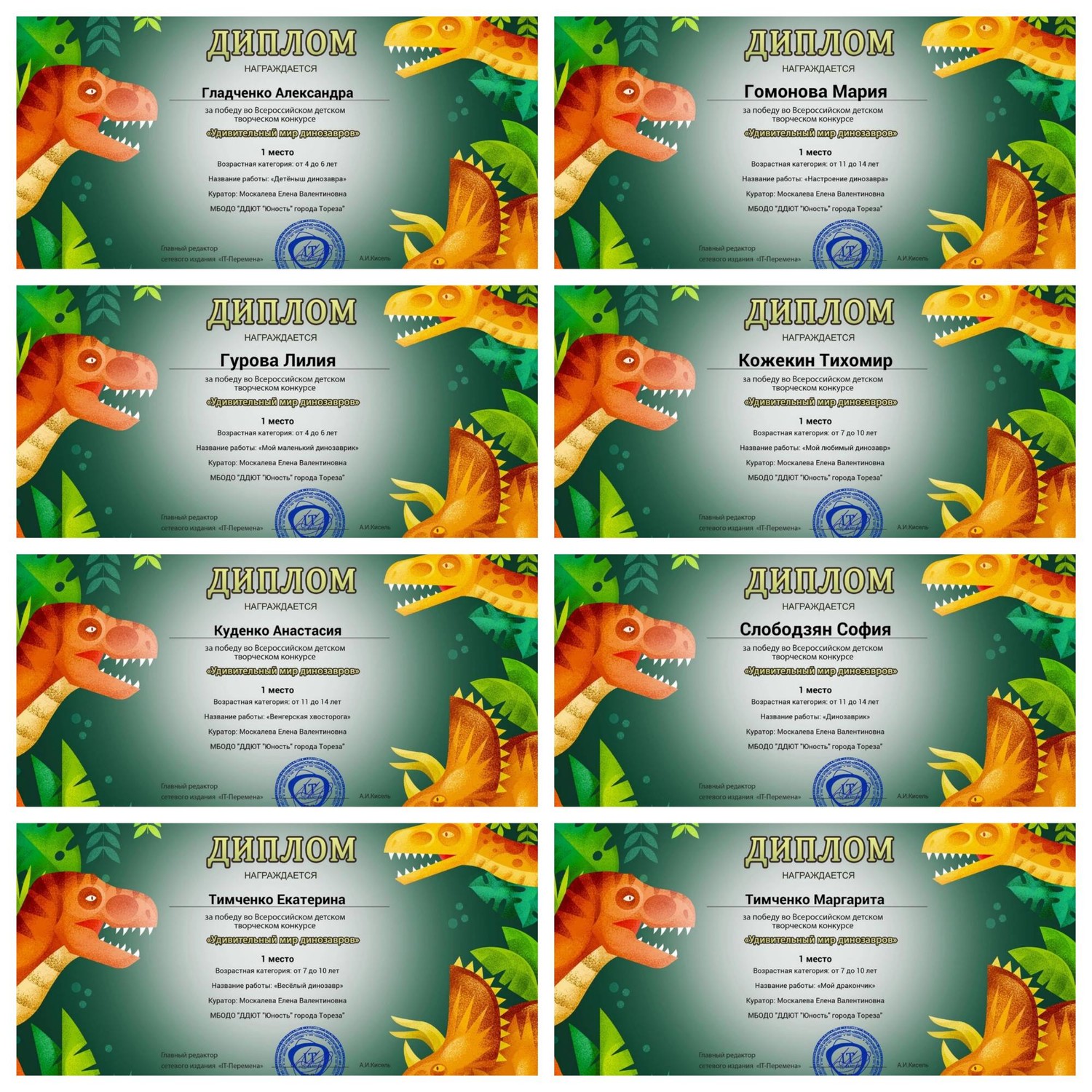 С 14 по 20 марта 2024 обучающиеся образцового художественного коллектива «Школа красоты» (педагог Москалева Е.В.) приняли участие во Всероссийском детском конкурсе рисунков «Удивительный мир динозавров». Организатор конкурса: «Образовательный центр «IT-Перемена» (г. Курган). Организатор конкурса приглашает юных художников отправиться в захватывающее путешествие в доисторический мир динозавров! От гигантских диплодоков до проворных велоцирапторов, каждая работа — это шанс привнести в жизнь своего собственного уникального динозавренка. Поделитесь с нами вашей версией удивительного мира динозавров через художественную интерпретацию, и дайте живым существам древности снова ожить на бумаге! Цель конкурса: предоставление возможности демонстрации творческих способностей в конкурсной форме. Задачи конкурса: • конкурс направлен на стимулирование творческой деятельности; • выявление, сопровождение и поддержку талантливых участников конкурса в области декоративно-прикладного творчества. Итоги конкурса – 8 первых и 2 вторых места! 1-е место – Гладченко Александра, Гурова Лилия, Кожекин Тихомир, Куденко Анастасия, Слободзян София, Гомонова Мария, Тимченко Екатерина, Тимченко Маргарита. 2-е место – Зубилин Александр, Береговой Егор. Педагог награждена благодарственным письмом. Молодцы! Ждём следующих побед! | |