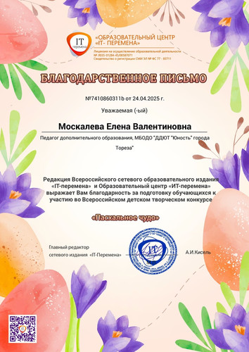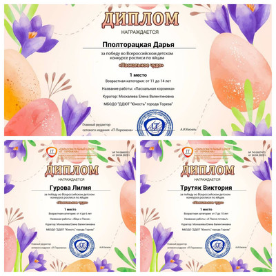 В апреле обучающиеся образцового художественного коллектива «Школа красоты (педагог Москалева Е.В.) приняли участие во Всероссийском детском конкурсе росписи по яйцам «Пасхальное чудо» (платформа ИТ-Перемена, г. Курган). Роспись яиц — распространённый вид декоративного искусства у многих народов, а также привычная всем нам традиция в день Пасхи. Мы приглашаем тебя стать частью этой удивительной традиции и принять участие в творческом конкурсе «Пасхальное чудо». Укрась яйцо яркими красками, создавай красивые узоры, рисуй символы праздника и сделай своё яйцо настоящим чудом Пасхи! Это твой шанс выразить свою фантазию и поделиться с миром теплом и радостью. Итоги конкурса – 3 первых места! 1 место – Гурова Лилия, Полторацкая Дарья, Трутяк Виктория. Педагог награждена благодарственным письмом. Поздравляем! | |
