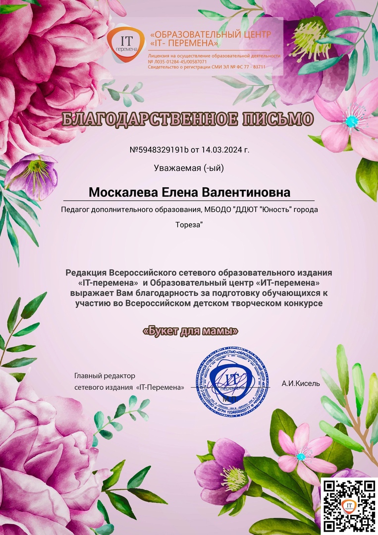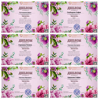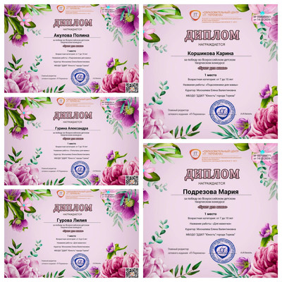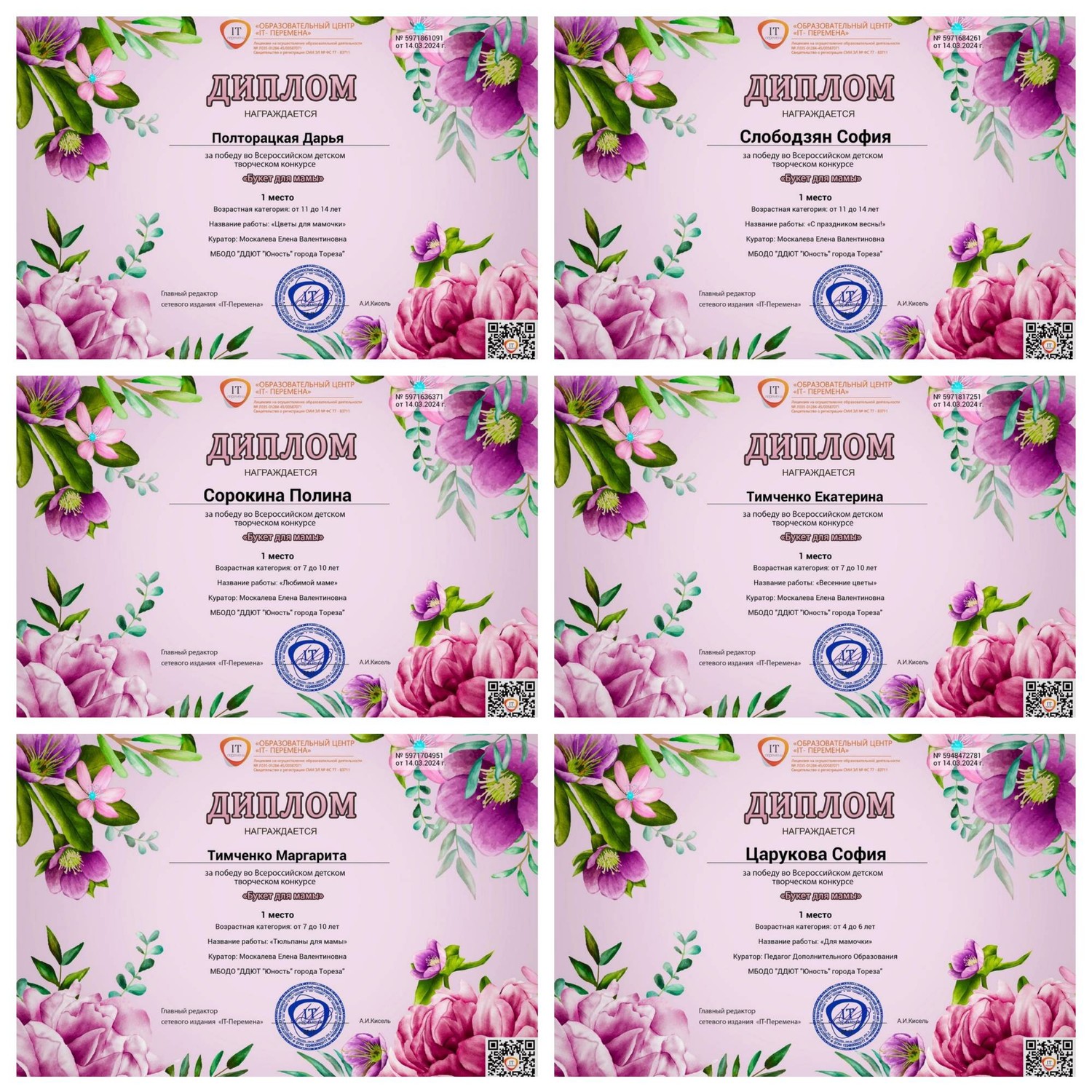 С 7 по 13 марта 2024 обучающиеся образцового художественного коллектива «Школа красоты» (педагог Москалева Е.В.) приняли участие во Всероссийском детском творческом конкурсе «Букет для мамы». Организатор конкурса: «Образовательный центр «IT-Перемена». Цель конкурса: предоставление возможности демонстрации творческих способностей в конкурсной форме. Задачи конкурса: • конкурс направлен на стимулирование творческой деятельности; • выявление, сопровождение и поддержку талантливых участников конкурса в области декоративно-прикладного творчества. Итоги конкурса – 11 первых мест! 1-е место – Царукова София, Сорокина Полина, Тимченко Екатерина, Тимченко Маргарита, Слободзян София, Полторацкая Дарья, Подрезова Мария, Коршикова Карина, Гурова Лилия, Гурина Александра, Акулова Полина. Педагог награждена благодарственным письмом. Молодцы! Поздравляем! | |
