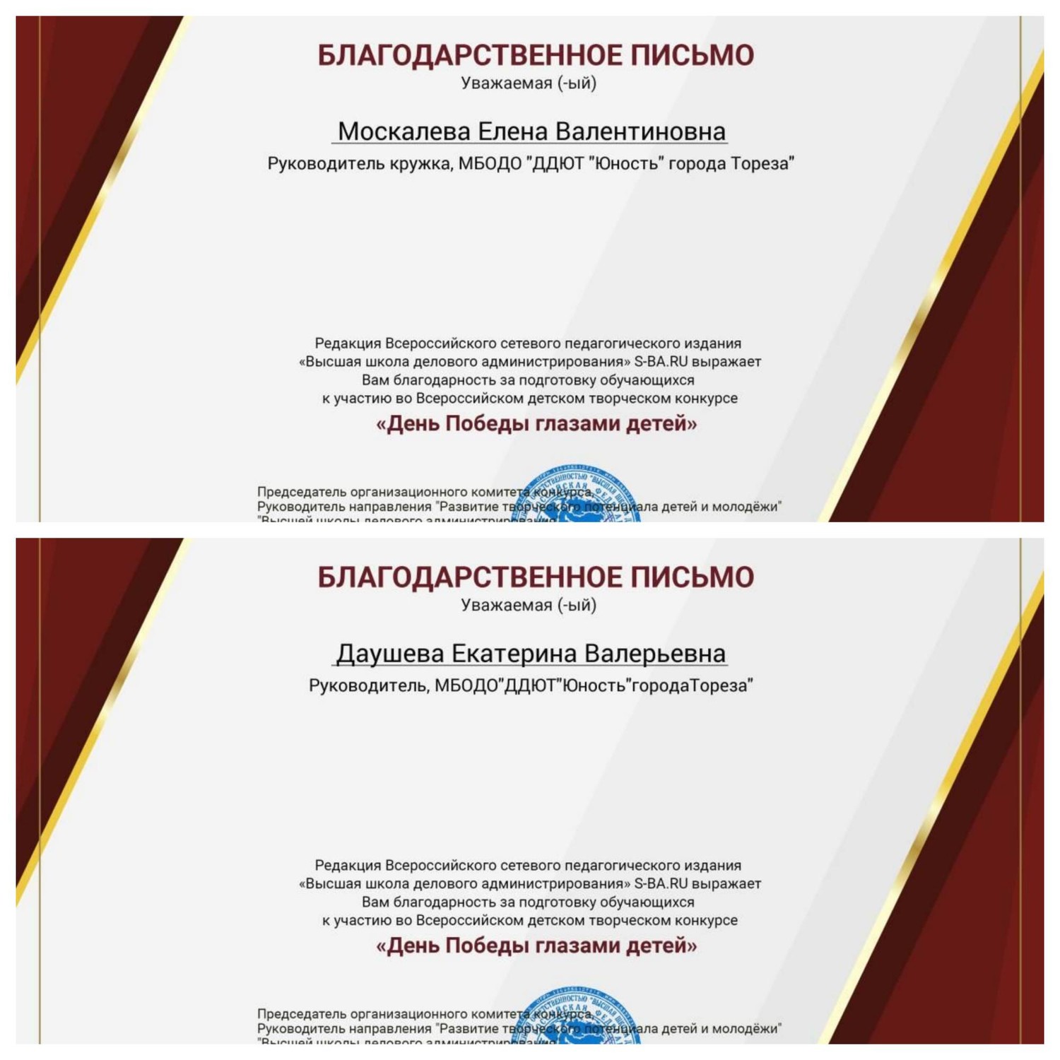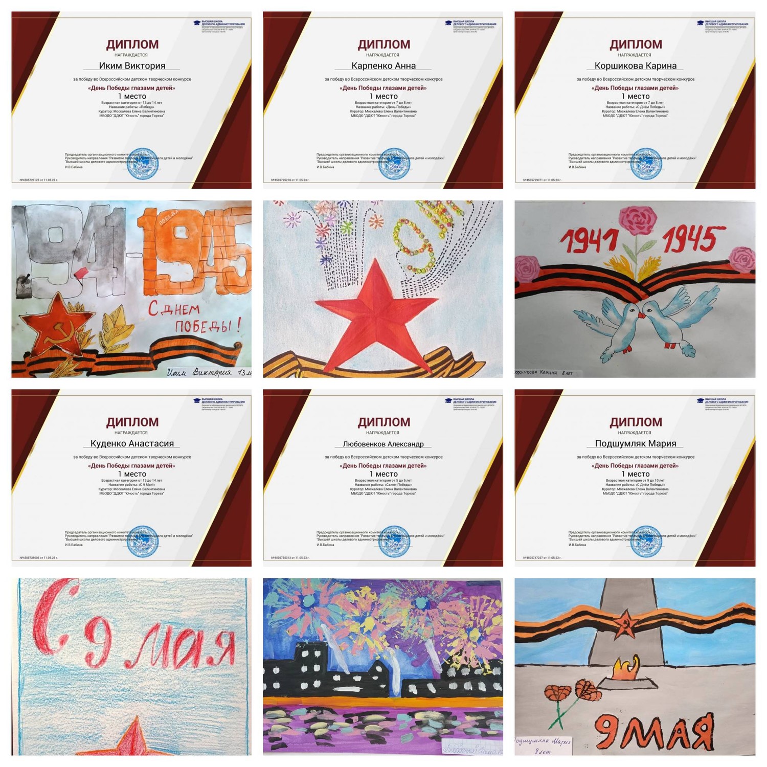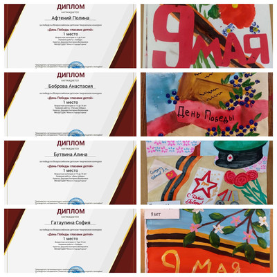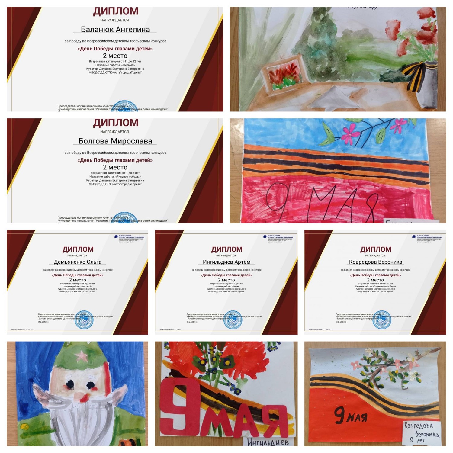 С 5 по 10 мая обучающиеся образцового художественного коллектива «Школа красоты» (педагог Москалева Е.В.) и народного художественного коллектива «Живопись и графика» (педагог Даушева Е.В.) приняли участие во Всероссийском детском творческом конкурсе аппликаций «День Победы глазами детей» (г. Екатеринбург). Организатор конкурса: Высшая школа делового администрирования. День Победы - светлый праздник, Я ему так рад, Потому что вместе с дедом Еду на парад! 9 Мая – значимая дата для нашей страны. В День Победы мы осознаём неразрывную связь времён и отдаём дань историческому прошлому. Это очень важный официальный праздник, который напоминает о патриотизме, духовных ценностях и лучших человеческих качествах. Результаты конкурса – 13 первых мест и 5 вторых! Народный художественный коллектив «Живопись и графика» (педагог Даушева Е.В.) – 7 первых и 5 вторых: 1-е места – Клыпа София, Боярова Анастасия, Афтений Полина, Бутвина Алина, Олейник Арина, Гатаулина София, Красовская Ева, 2-е места – Мульченко Полина, Ингильдеев Артём, Демьяненко Ольга, Баланюк Ангелина, Ковредова Ангелина. Образцовый художественный коллектив «Школа красоты» (педагог Москалева Е.В.) – 6 первых мест 1-е места – Карпенко Анна, Иким Виктория, Любовенков Александр, Подшумляк Мария, Куденко Анастасия, Коршикова Карина. Педагоги награждены благодарственными письмами. Поздравляем и желаем творческих успехов!