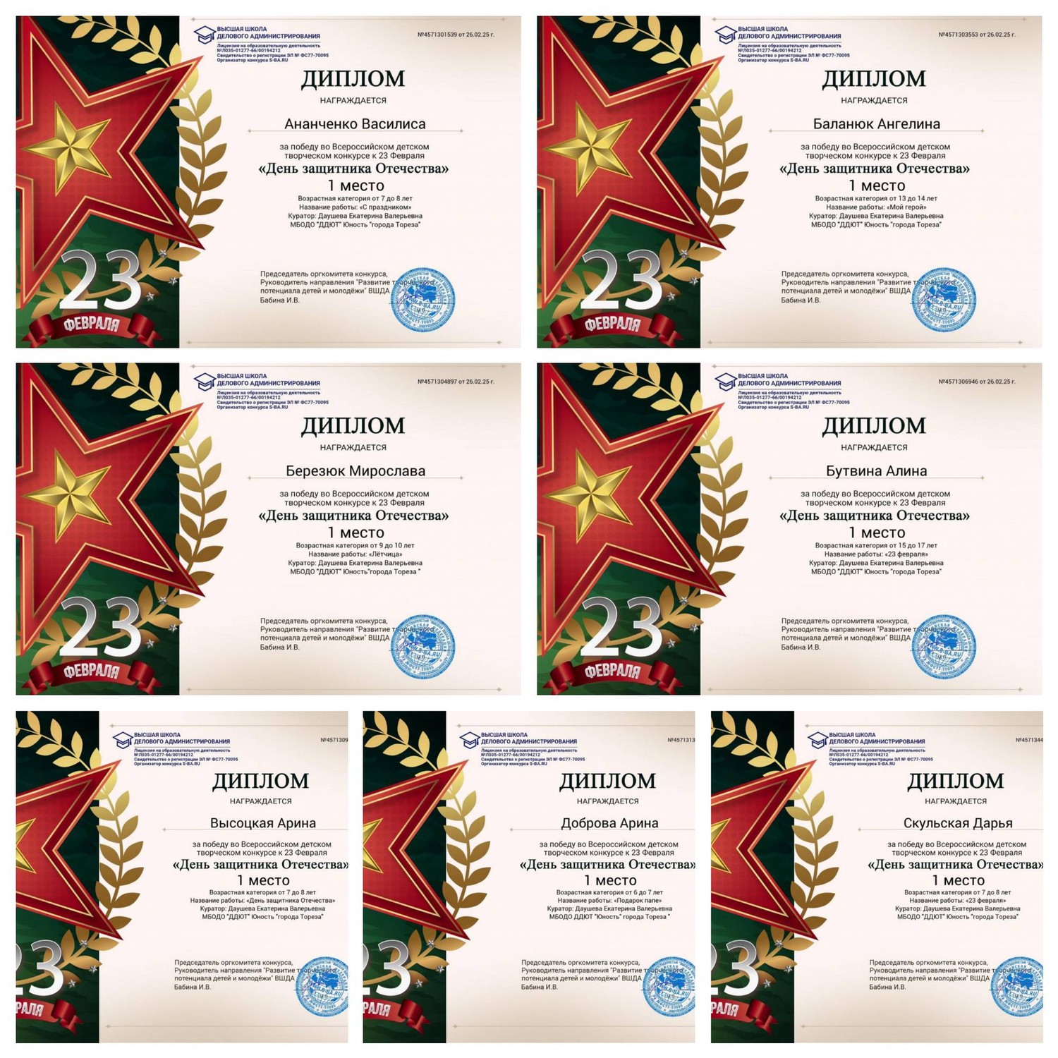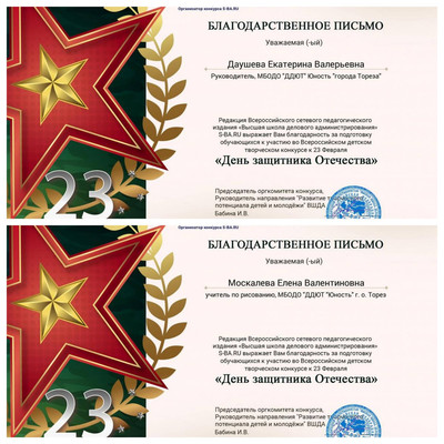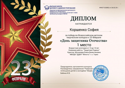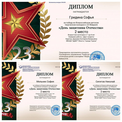 С 20 по 25 февраля обучающиеся ТО приняли участие во Всероссийском творческом конкурсе к 23 февраля «День защитника Отечества». В День защитника Отечества мы всей страной поздравляем всех причастных к армейской службе в России. Стоять на защите родины – это большое благое дело! В этот день в каждой семье звучат поздравления и добрые слова для дедов, отцов и сыновей. Итоги конкурса – 8 первых, 3 вторых и 1 третье место! Народный художественный коллектив «Живопись и графика» - 7 первых, 3 вторых, 1 третье место. 1-е место – Доброва Арина, Ананченко Василиса, Баланюк Ангелина, Березюк Мирослава, Бутвина Алина, Высоцкая Арина, Скульская Дарья. 2-е место – Гридина Софья, Мельник София, Сигитов Николай. 3-е место – Алексеенко Маша.