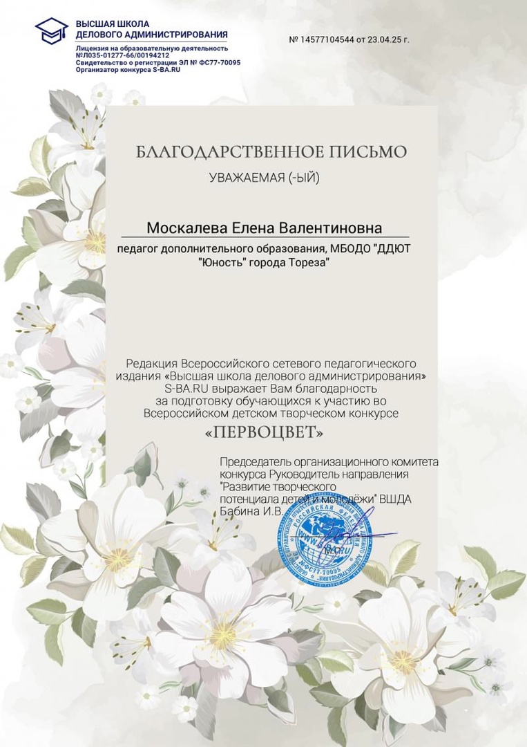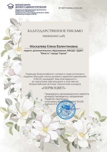 Обучающаяся образцового художественного коллектива «Школа красоты» (педагог Москалева Е.В.) Гурова Лилия приняли участие во Всероссийском детском творческом конкурсе «Первоцвет» (ВШДА, г. Екатеринбург) и стала лауреатом 1 степени! Педагог награждена благодарственным письмом. Так держать! | |