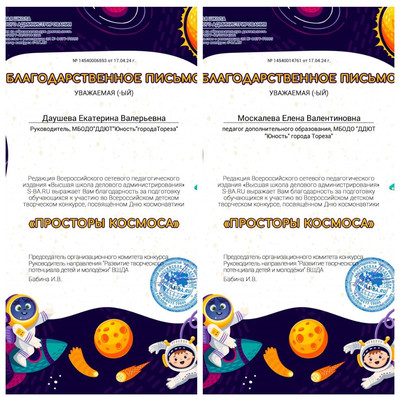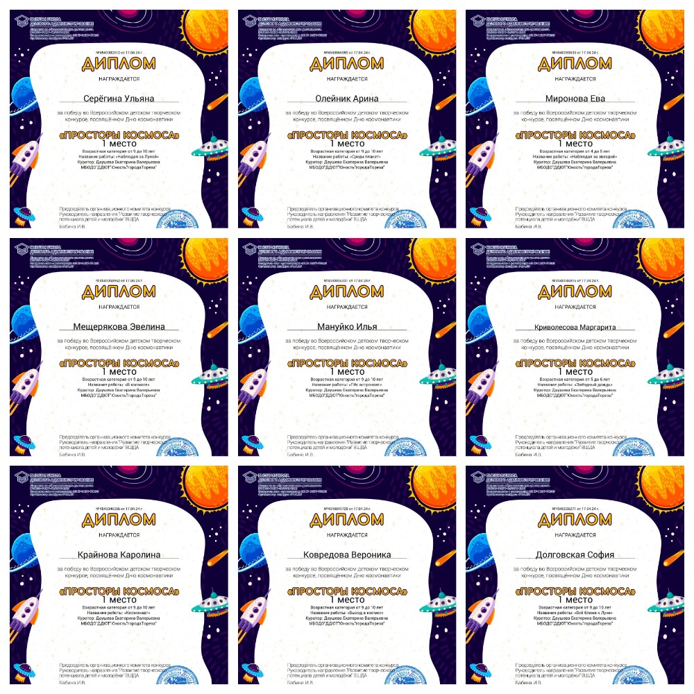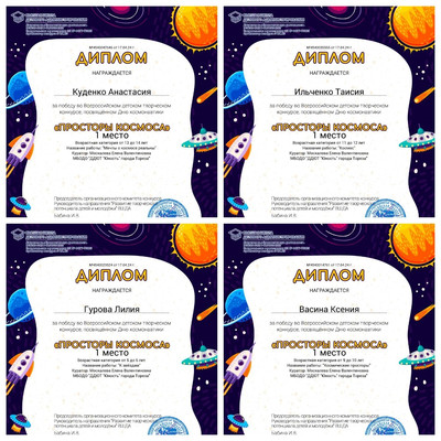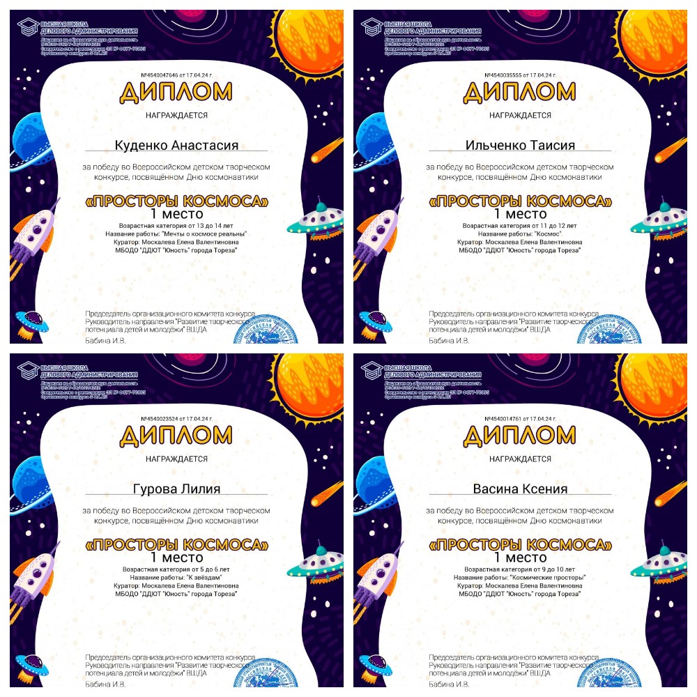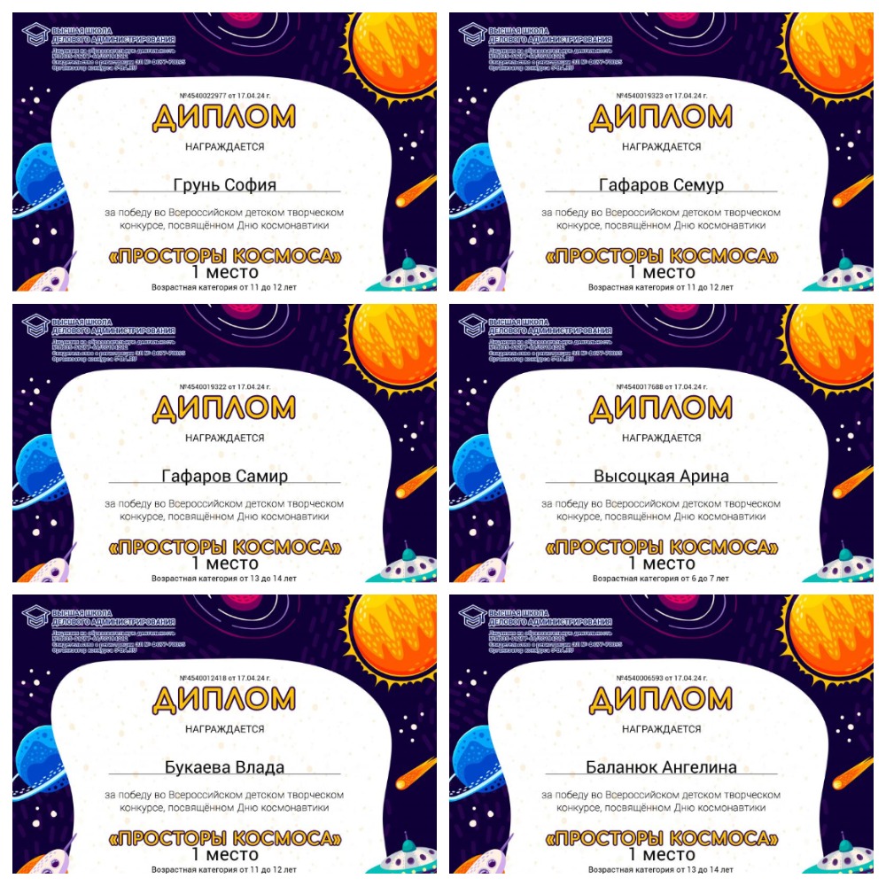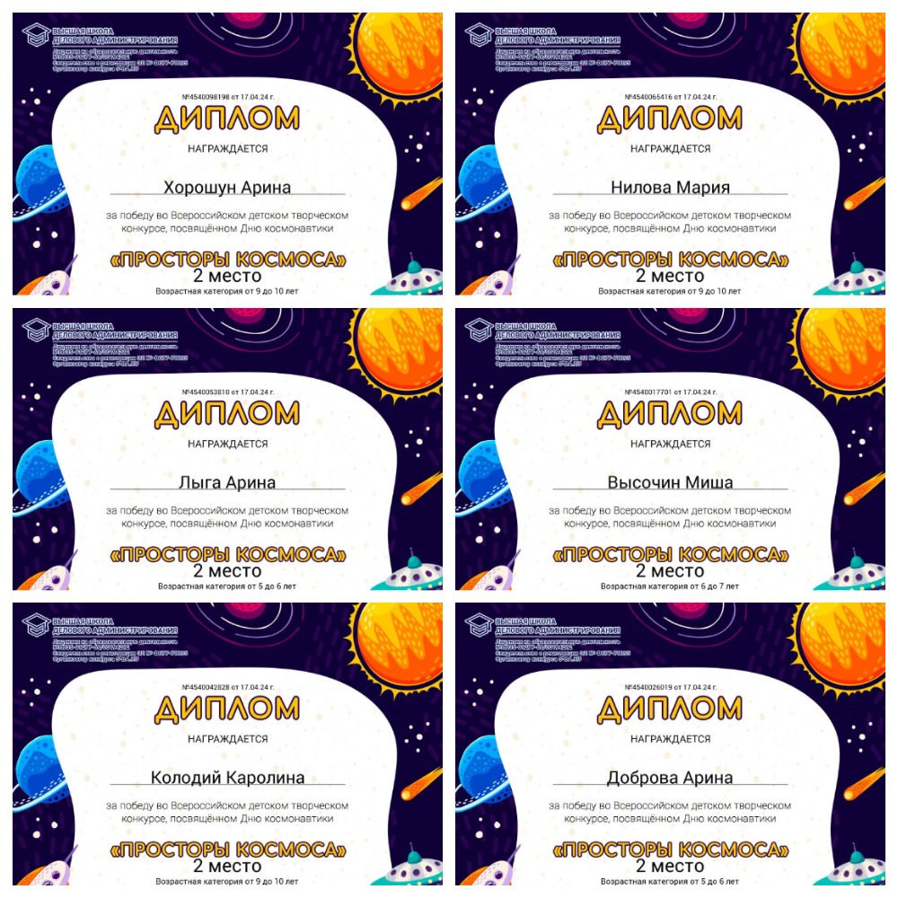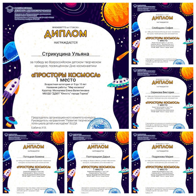 С 11 по 16 апреля обучающиеся ТО «Школа красоты» (педагог Москалева Е.В.) и «Живопись и графика» (педагог Даушева Е.В.) приняли участие во Всероссийском детском творческом конкурсе, посвящённом Дню космонавтики «Просторы космоса» (ВШДА, г. Екатеринбург). Основные цели и задачи Конкурса: • всестороннее содействие развитию детского изобразительного и декоративно-прикладного творчества; • предоставление участникам возможности в состязательной форме развить и продемонстрировать свои творческие способности; • популяризация истории, этапов развития и успехов отечественной космонавтики. Итоги конкурса – 25 первых, 6 вторых и 1 третье место! Народный художественный коллектив «Живопись и графика» - 15 первых, 6 вторых, 1 третье место: 1 место – Баланюк Ангелина, Букаева Влада, Высоцкая Арина, Гафаров Самир, Гафаров Семур, Грунь София, Долговская София, Ковредова Вероника, Крайнова Каролина, Криволесова Маргарита, Мануйко Илья, Мещерякова Эвелина, Миронова Ева, Олейник Арина, Серёгина Ульяна. 2 место – Высочин Михаил, Доброва Арина, Колодий Каролина, Лыга Арина, Нилова Мария, Хорошун Арина. 3 место – Бырка Злата. Образцовый художественный коллектив «Школа красоты» - 10 первых мест: 1 место – Васина Ксения, Гурова Лилия, Ильченко Таисия, Куденко Анастасия, Подрезова Мария, Полторацкая Дарья, Потоцкая Божена, Серикова Виктория, Слободзян София, Стрикуцина Ульяна. Педагоги награждены благодарственными письмами. Поздравляем с отличными результатами! | |